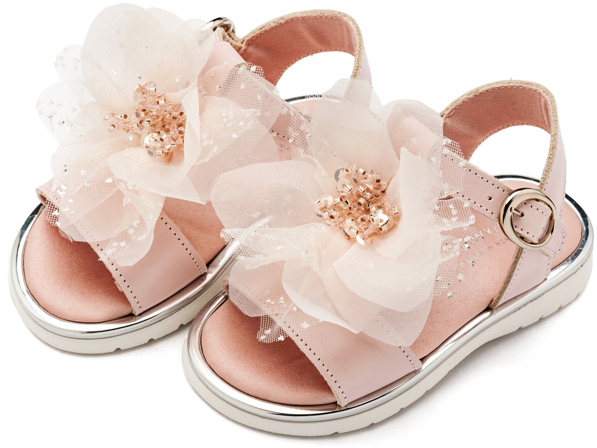 Δερμάτινο Πέδιλο με Χειροποίητο Λουλούδι απο Τούλι σε Ροζ Χρώμα