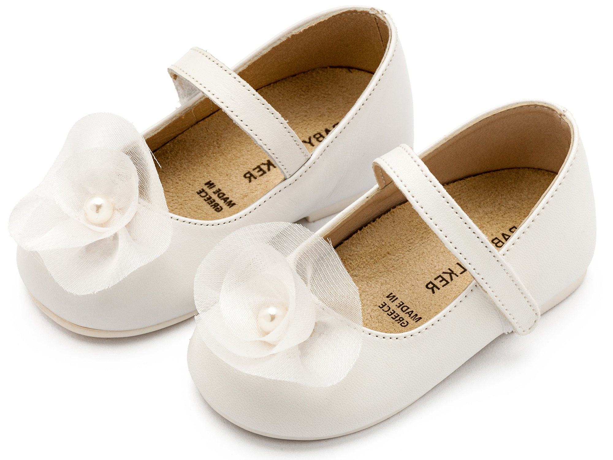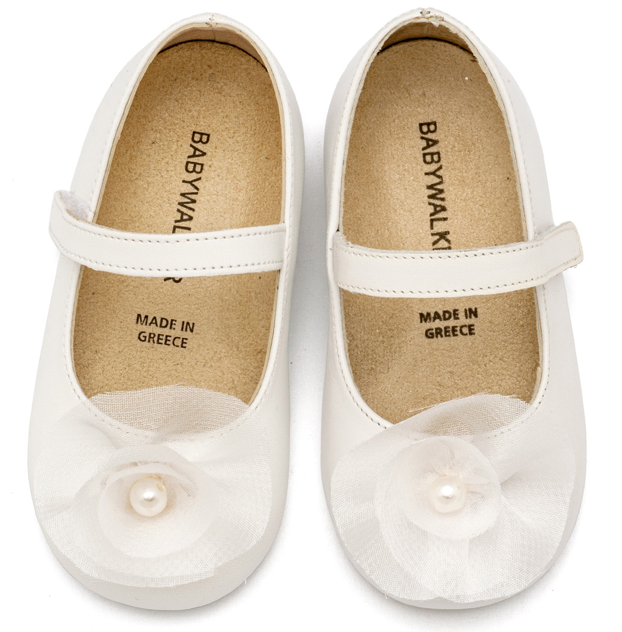 Γοβάκι Μονή Μπαρέτα με Χειροποίητο Λουλούδι απο Οργάντζα και Πέρλα σε Λευκό Χρώμα