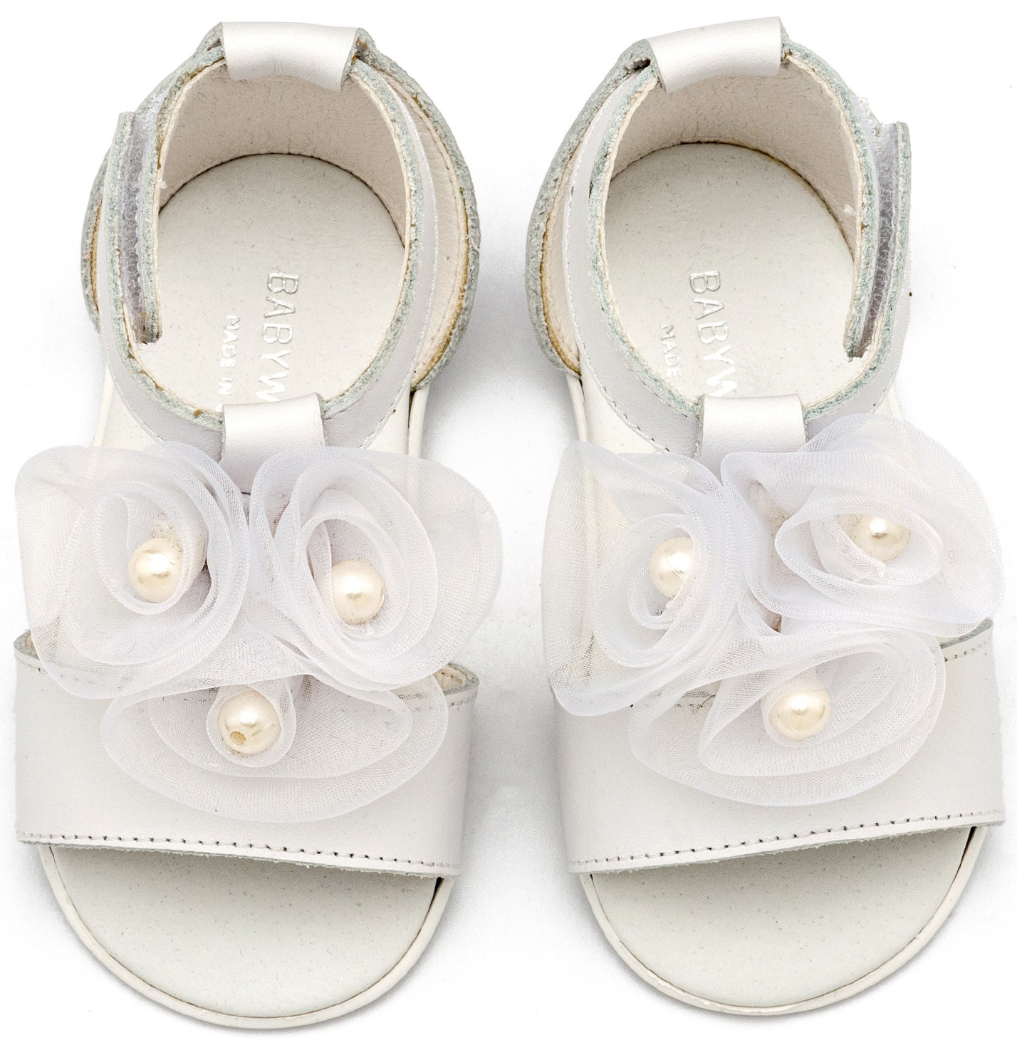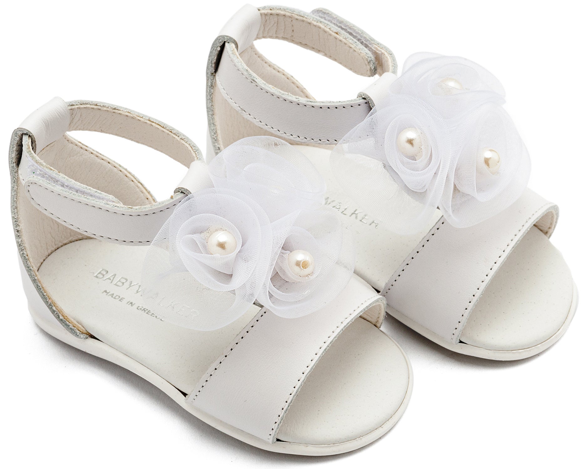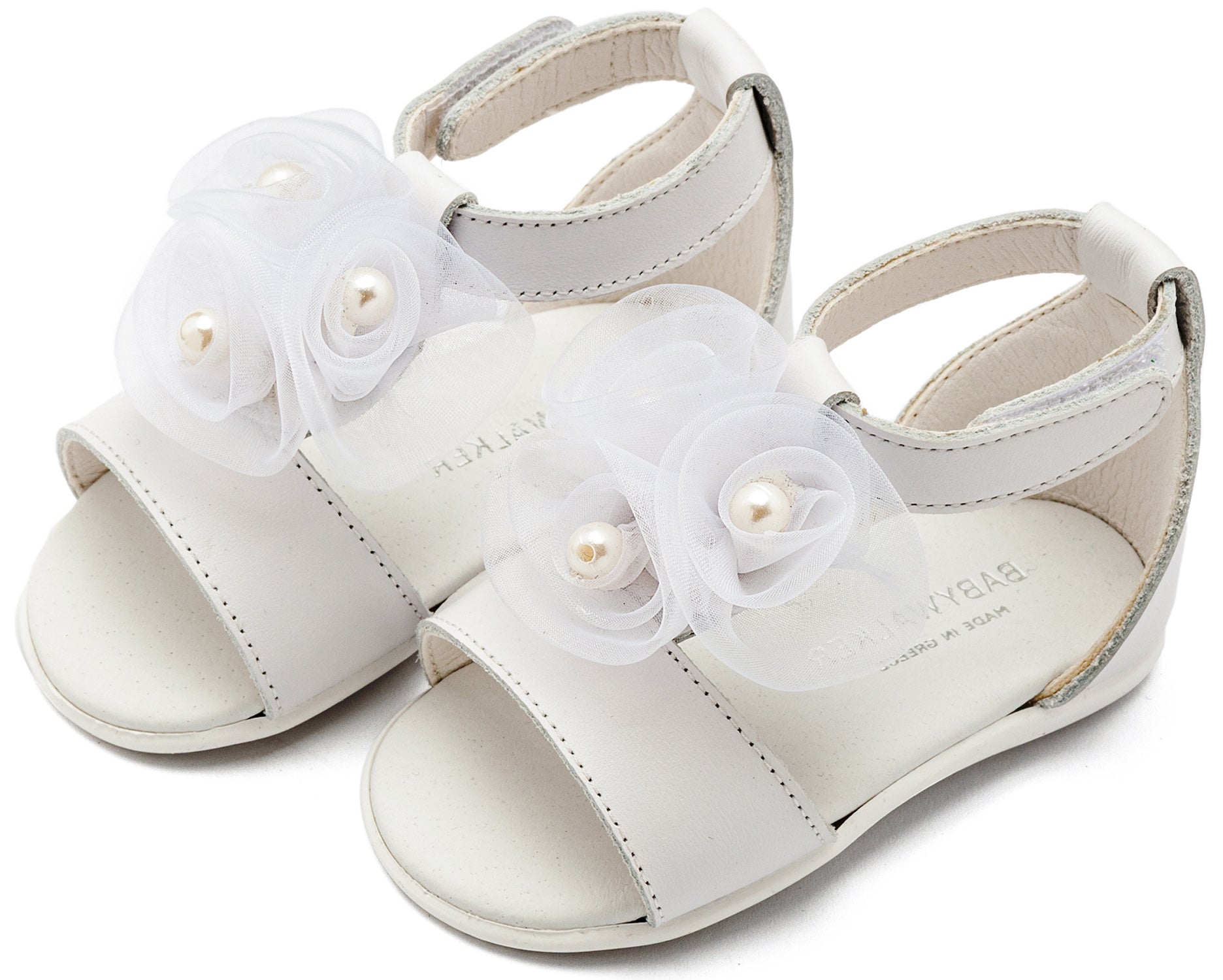 Δερμάτινο Πέδιλο Διακοσμημένο με Λουλούδια Chiffon και Πέρλες απο Δέρμα Νάπα σε Λευκό Χρώμα