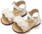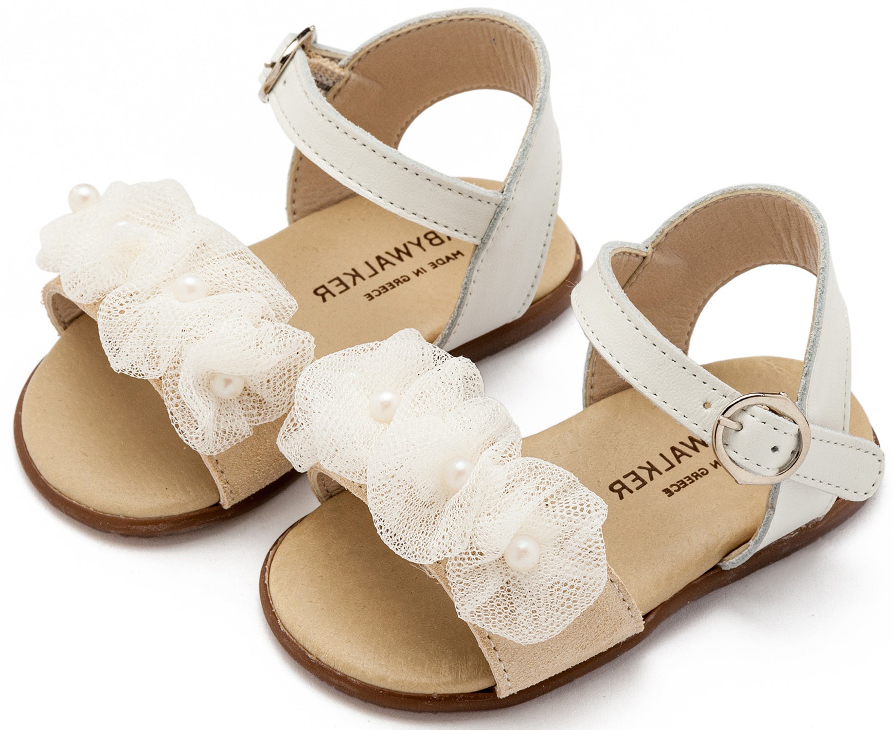 Δερμάτινο Πέδιλο Διακοσμημένο με Τούλινα Λουλουδάκια και Πέρλες από Δέρμα Πέρλα σε Εκρού Χρώμα