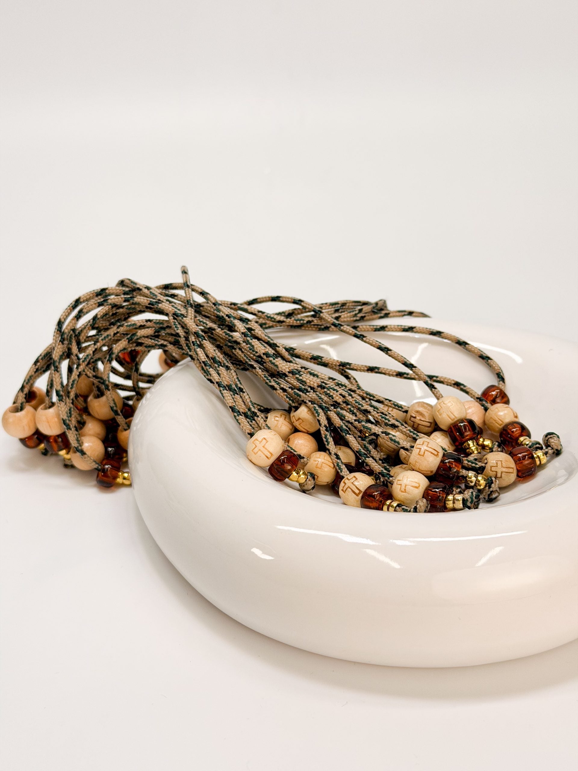 Ένα εκλεπτυσμένο χειροποίητο μαρτυρικό κομπολόι σε γήινες αποχρώσεις και χρυσές λεπτομέρειες.
