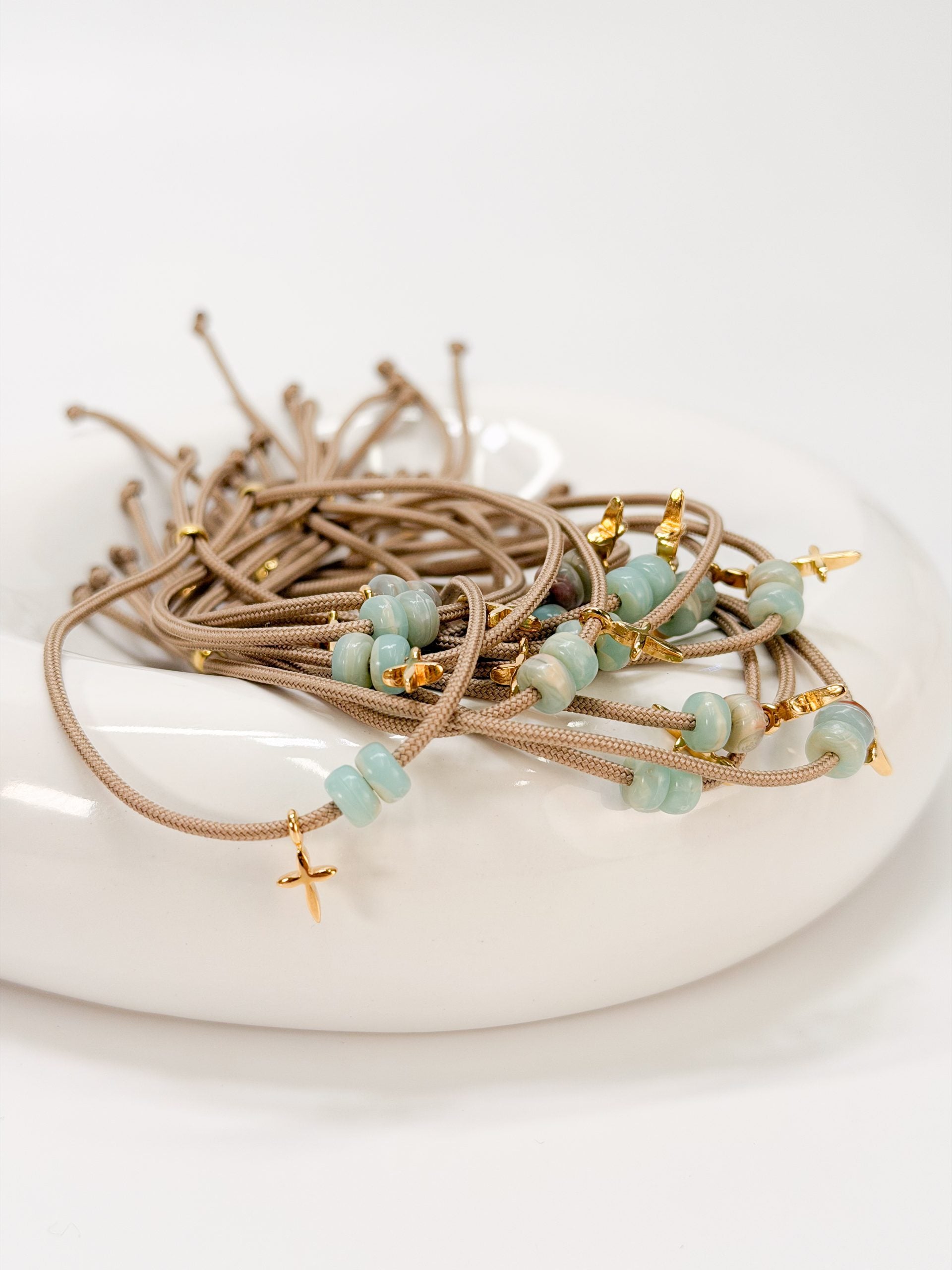 Ένα εκλεπτυσμένο χειροποίητο μαρτυρικό βραχιολάκι σε γήινες αποχρώσεις και χρυσές λεπτομέρειες.