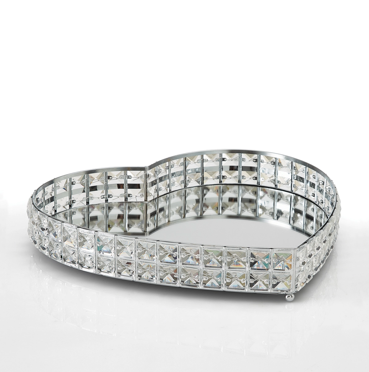 Μεταλλικός ασημένιος δίσκος σε σχήμα καρδιάς με επιφάνεια καθρέφτη και περίγραμμα διακοσμημένο με κρύσταλλα. Ιδανικός για γαμήλια δεξίωση και κομψή διακόσμηση τραπεζιού ή χώρου.