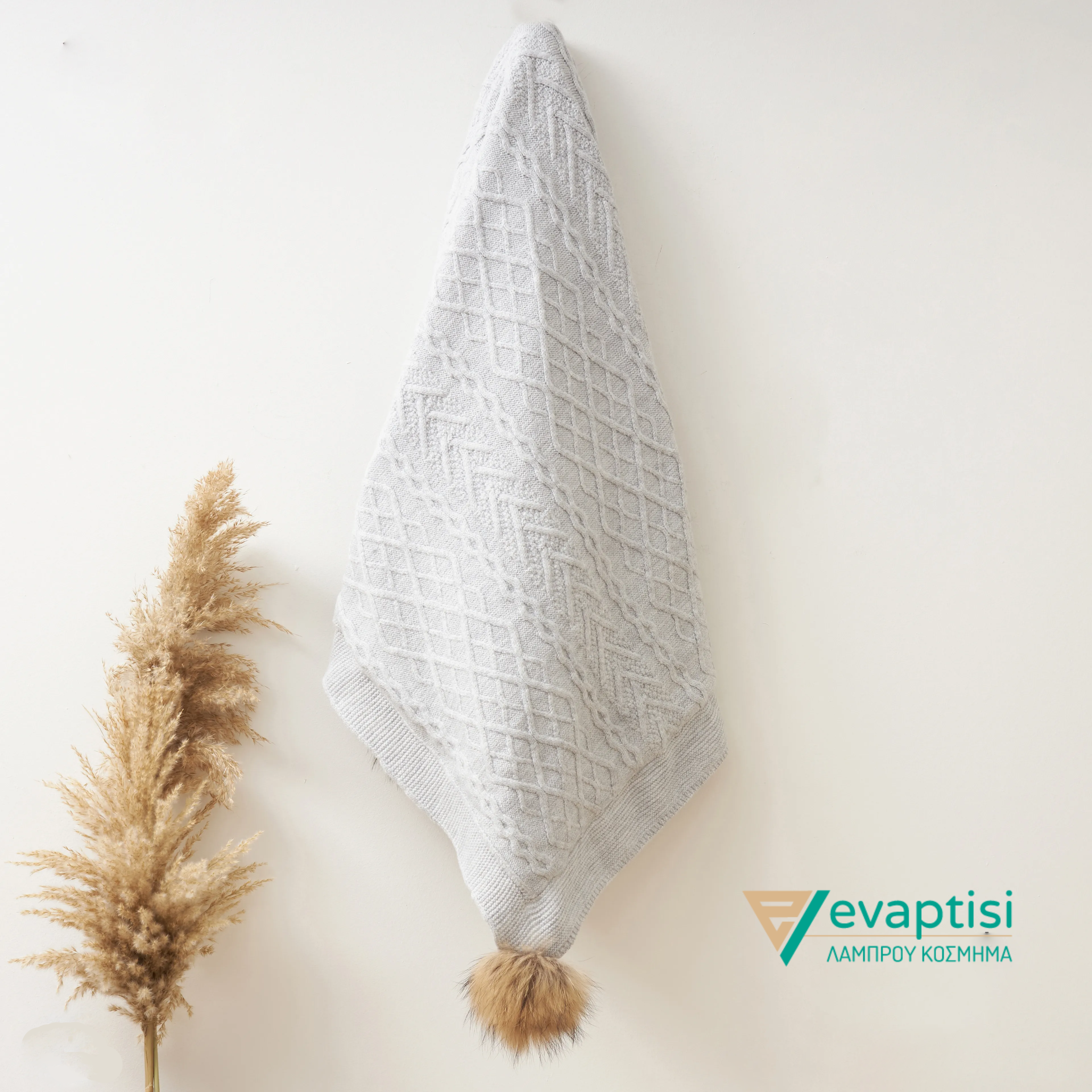 Κουβέρτα με γούνινες φούντες – Γκρι