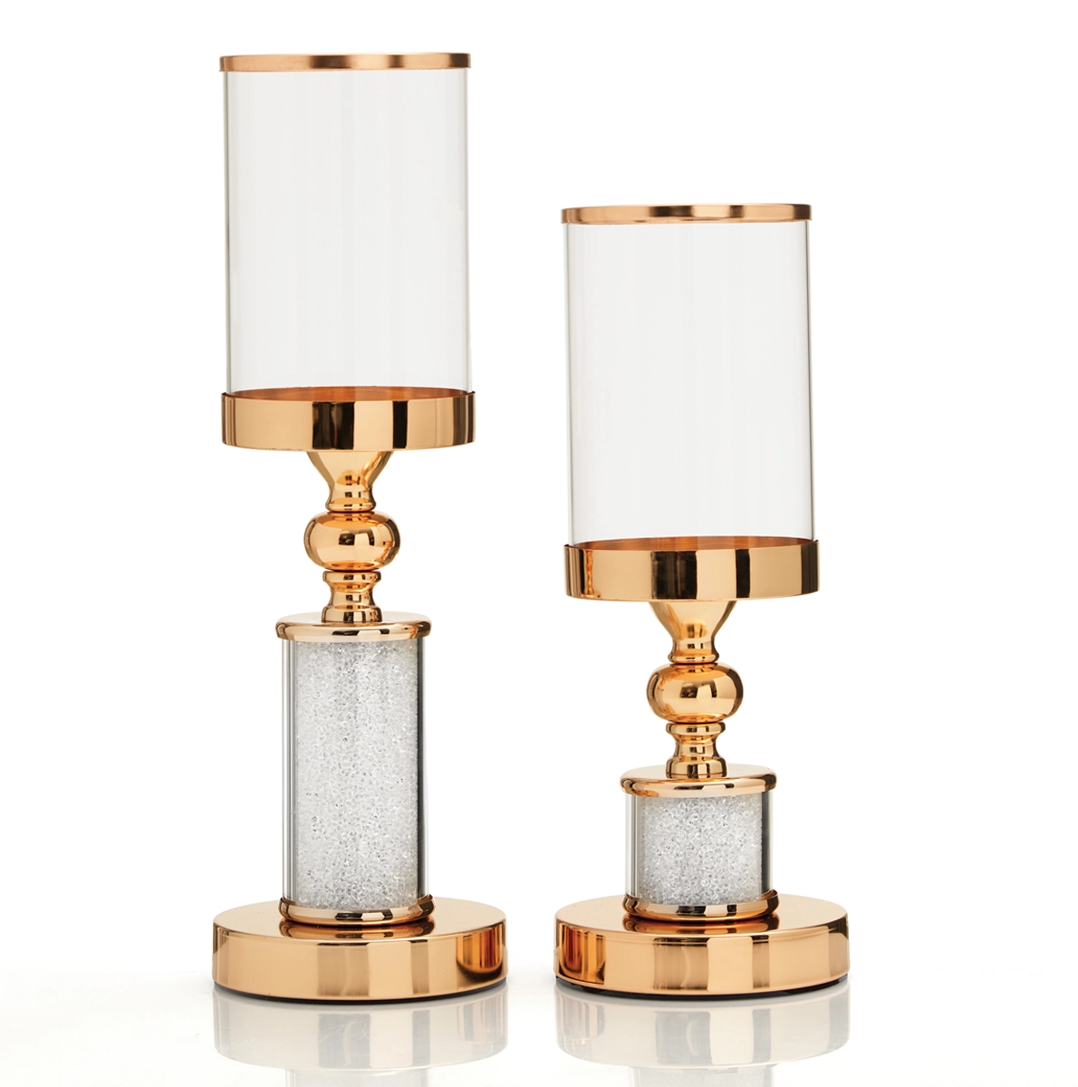 Το σετ λαμπάδων γάμου διαθέτει κρυστάλλινα κηροπήγια με χρυσές λεπτομέρειες και γυάλινο επάνω μέρος.