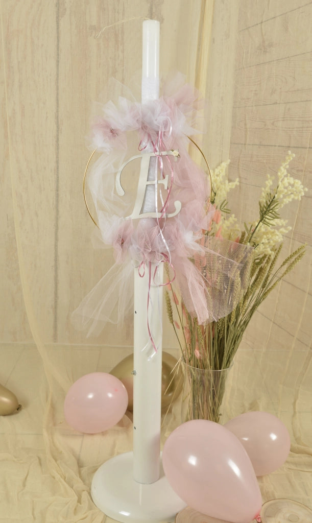 Μία ονειρική, χειροποίητη λαμπάδα βάπτισης με το μονόγραμμα της μικρής σας, σε λευκό - ροζ τούλινες αποχρώσεις.