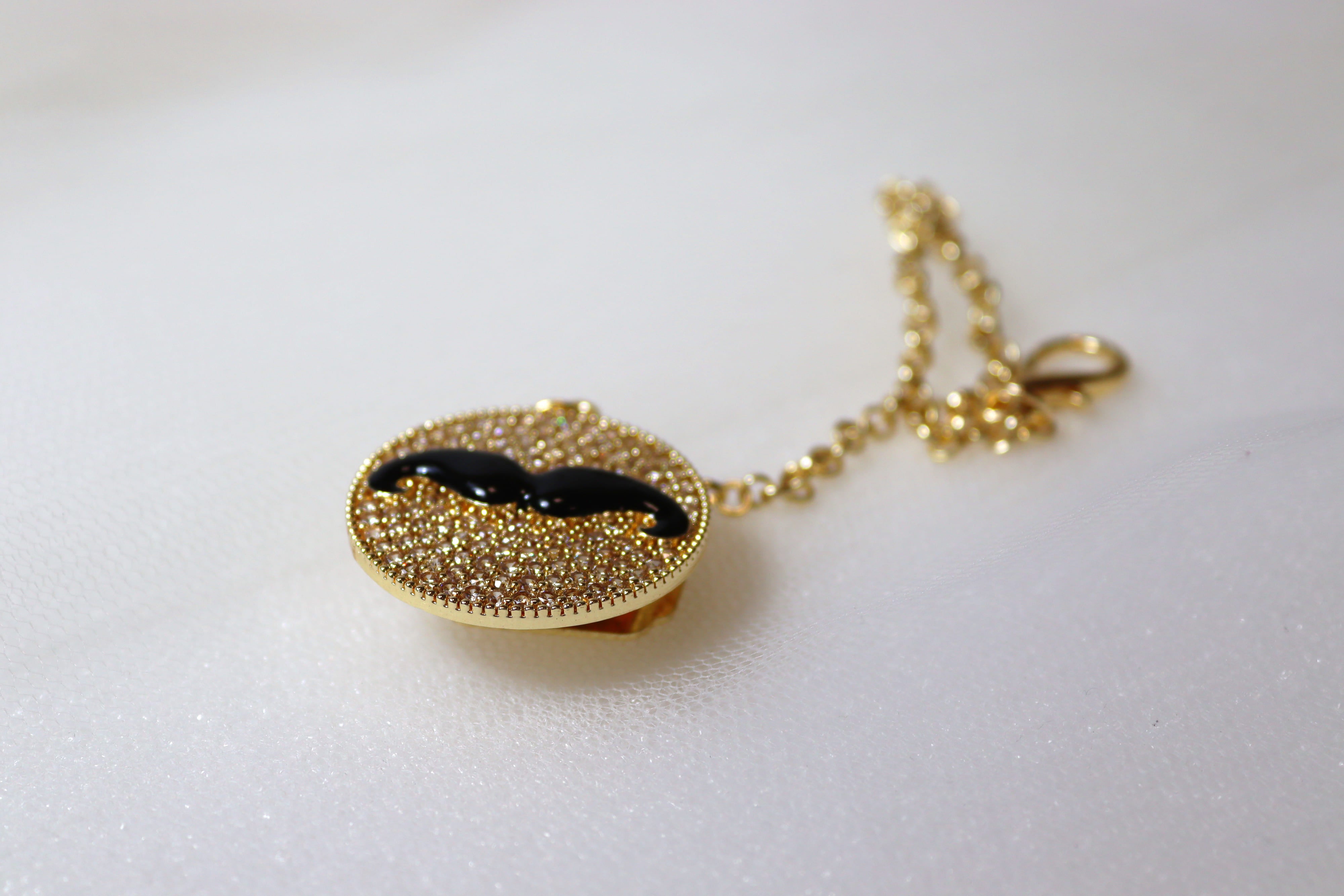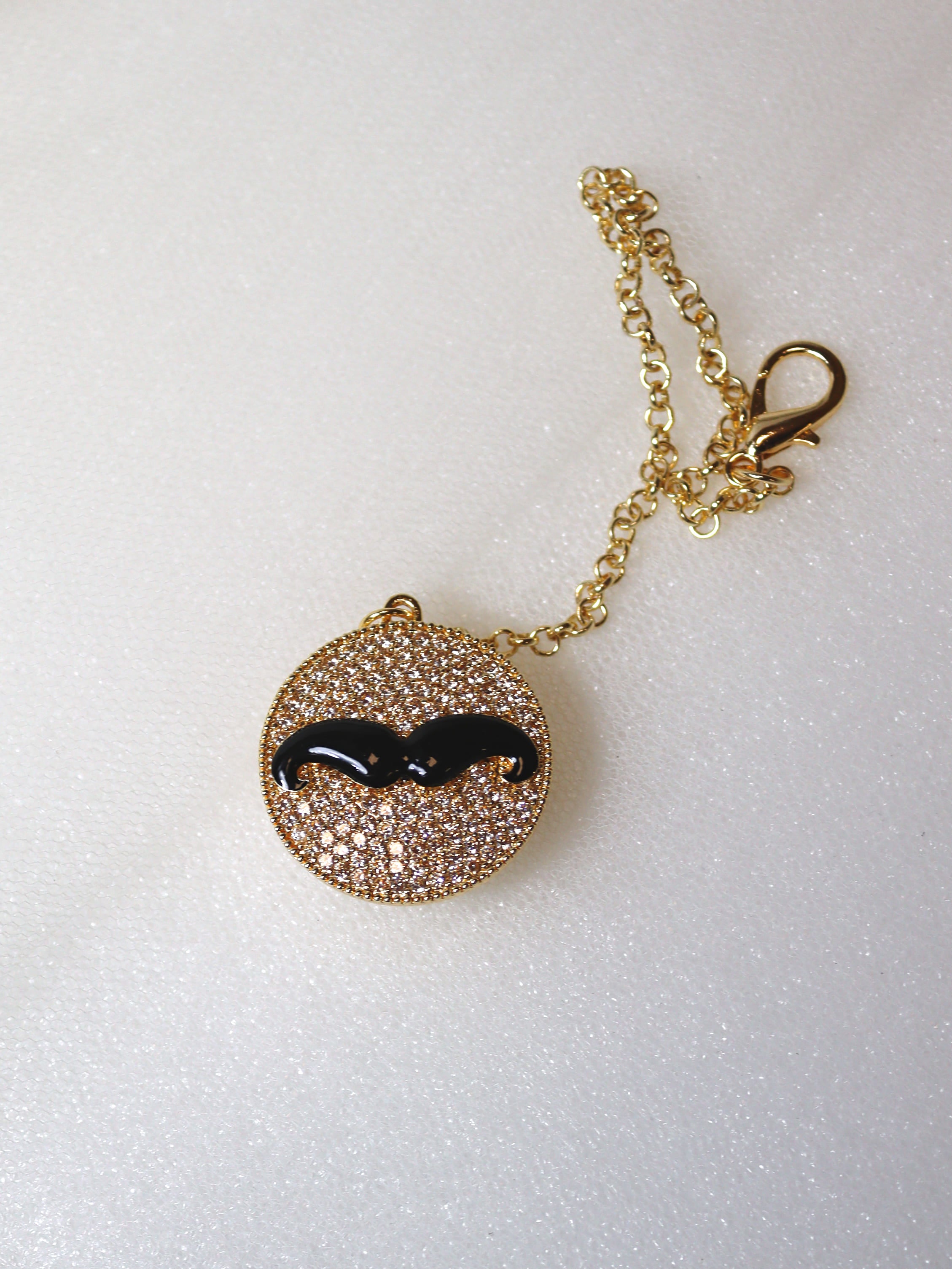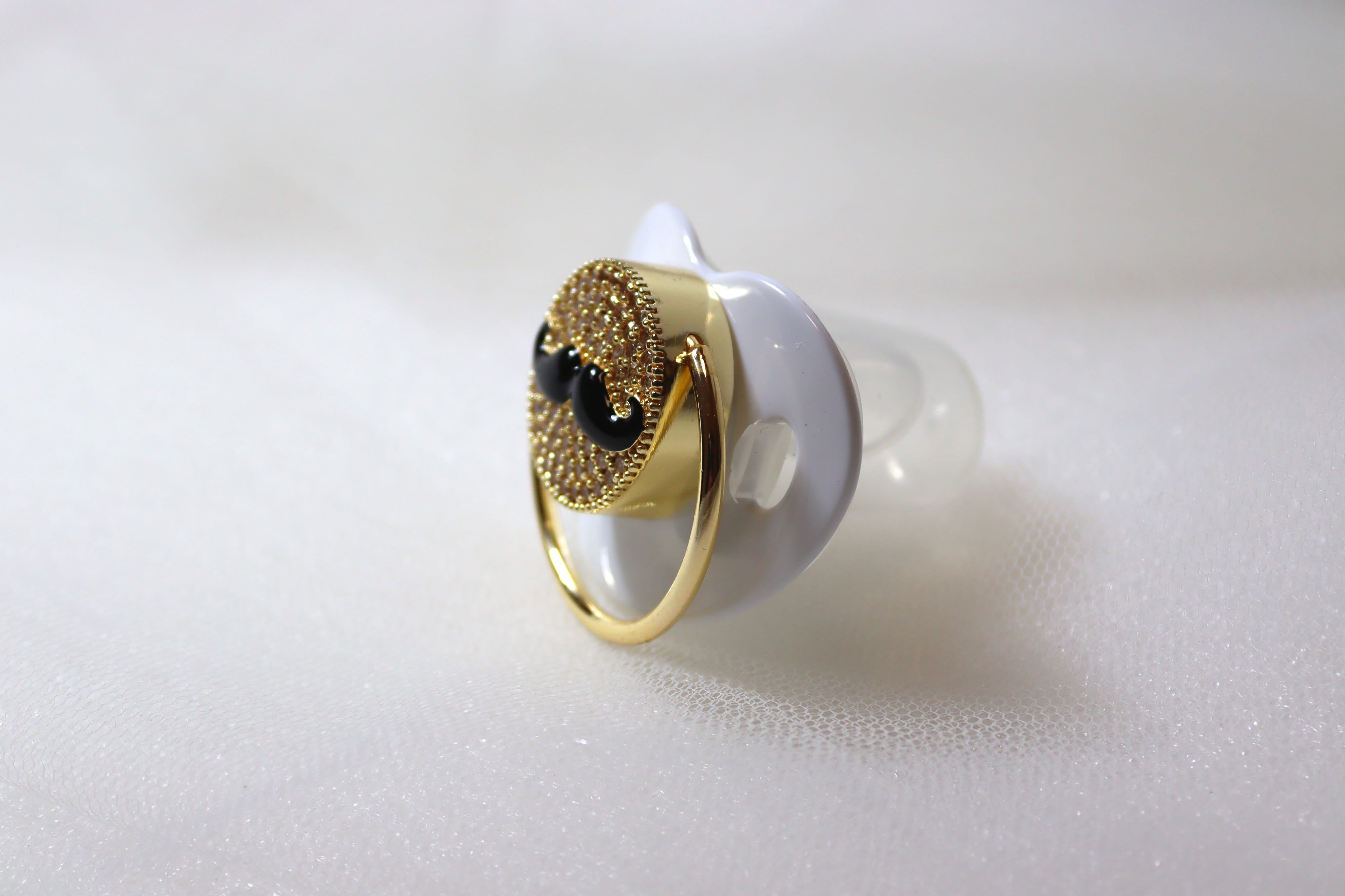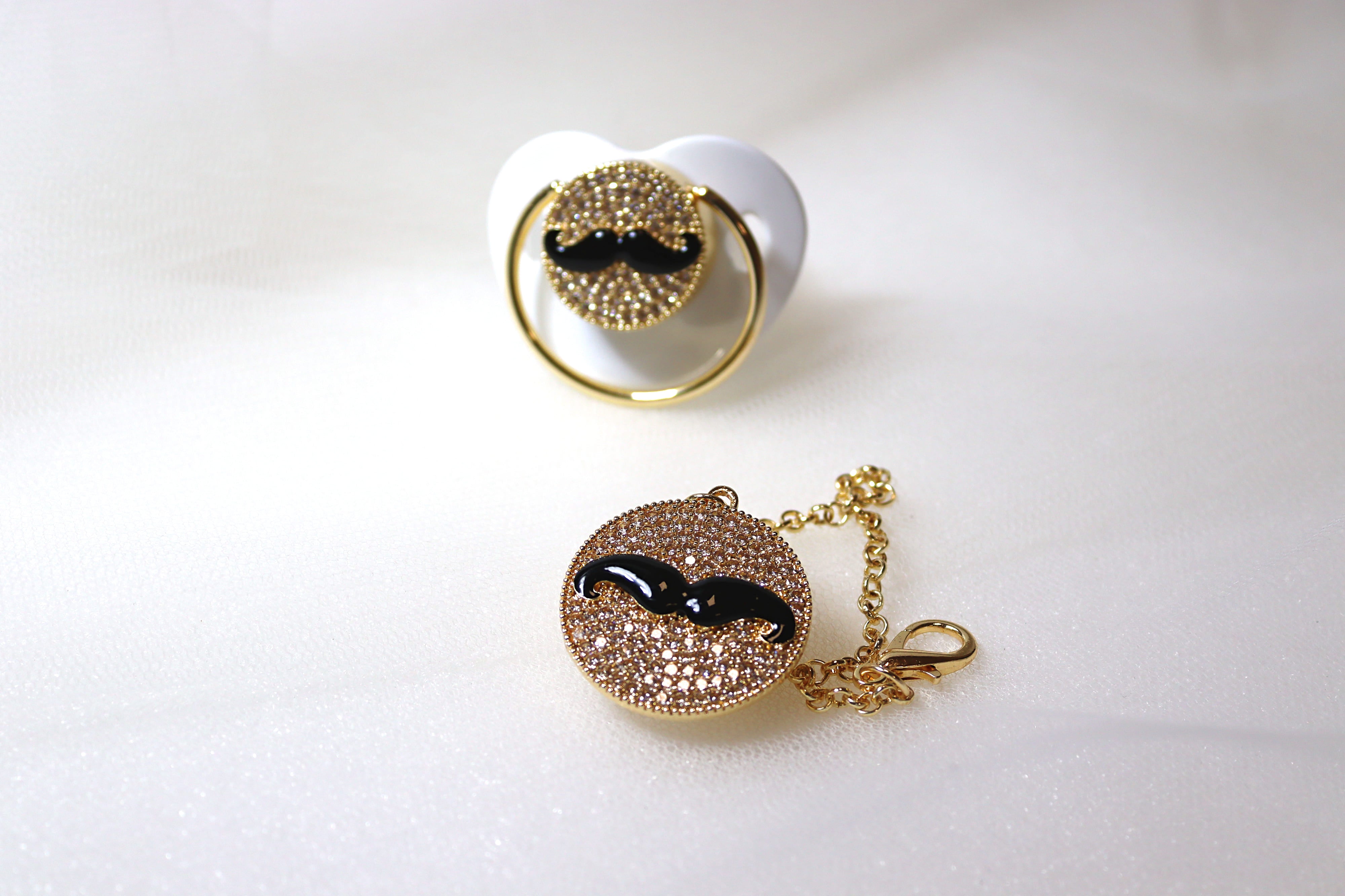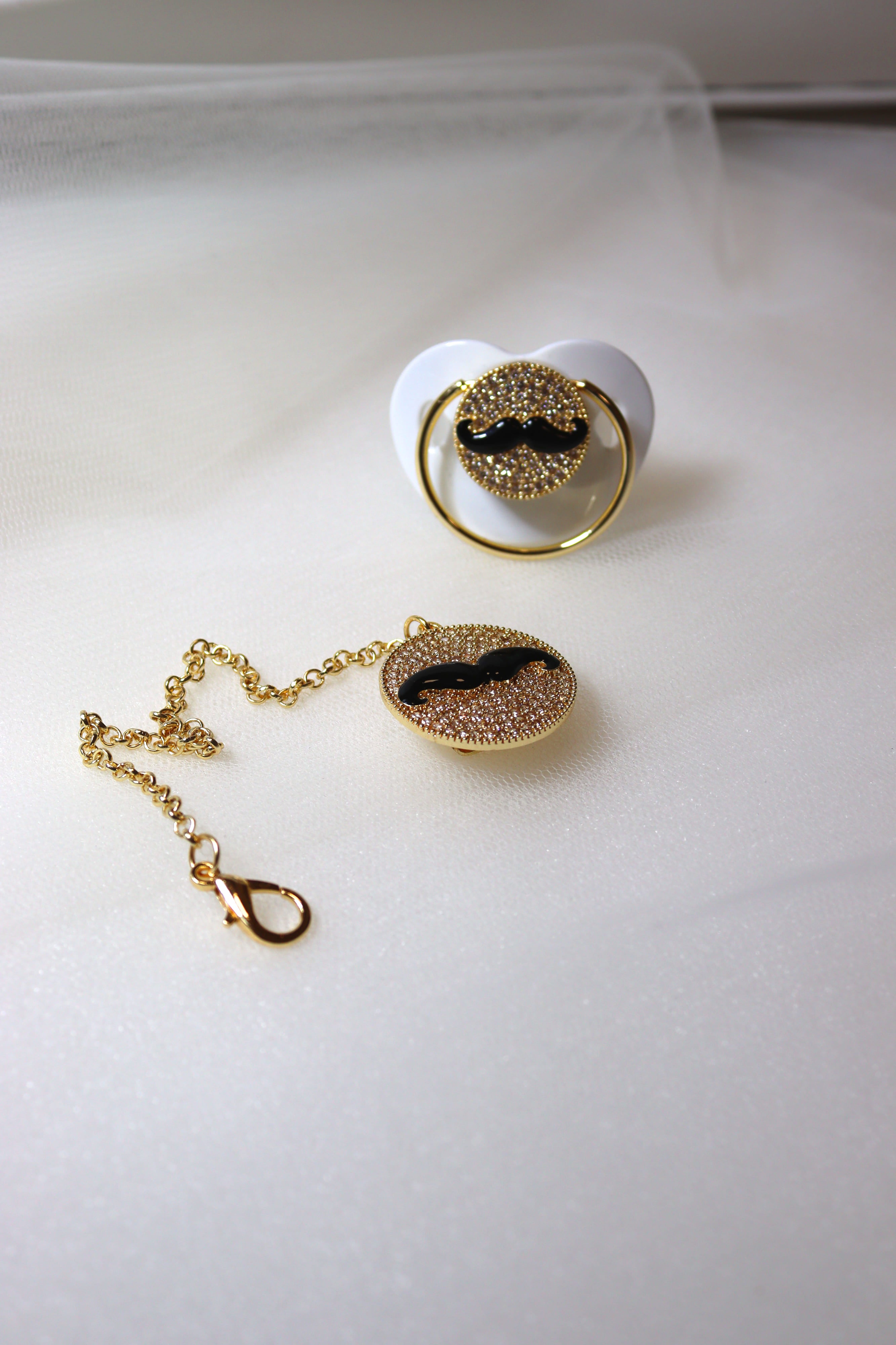 Χειροποίητη πιπίλα πολυτελείας με λευκή βάση και σχέδιο μουστάκι με ασορτί αλυσίδα κλιπ. Μοναδικές πιπίλες με στρας για τις πιο ξεχωριστές εμφανίσεις του μωρού σας!