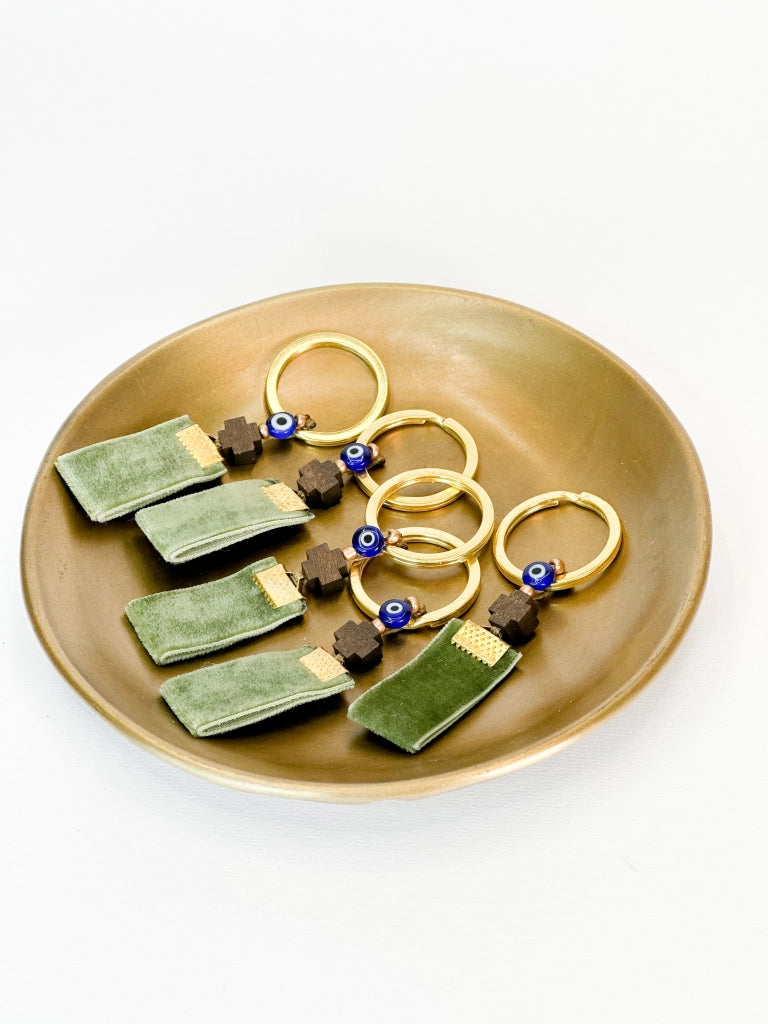 Μαρτυρικό μπρελόκ με λαδί βελούδο ύφασμα,καφέ σταυρό και μπλέ μάτι.Οι φωτογραφίες έχουν υποστεί επεξεργασία,ίσως να διαφέρουν λίγο τα χρώματα στην πραγματικότητα.