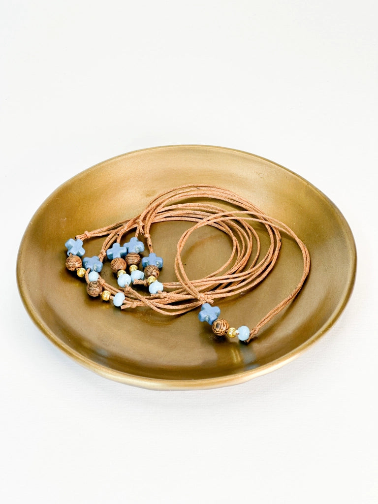 Μαρτυρικό βραχιόλι με καφέ κορδόνι,καφέ χάντρα,μπλε σταυρό και γαλάζια miyuki.