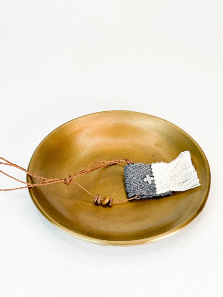 Μαρτυρικό κολιέ με καφέ κορδόνι,εκρού κρόσι,σταυρό και γκρι ύφασμα.Οι φωτογραφίες έχουν υποστεί επεξεργασία,ίσως να διαφέρουν λίγο τα χρώματα στην πραγματικότητα.