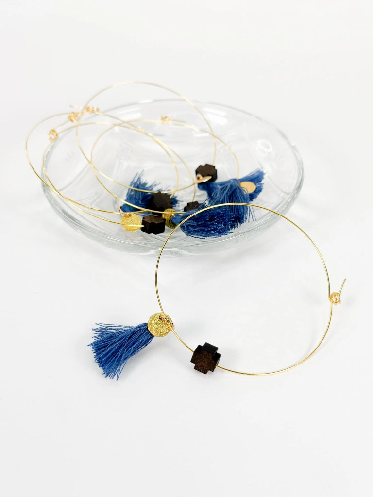 Χειροποίητο Μαρτυρικό βραχιόλι για αγόρι σε μπλε αποχρώσεις με χρυσό μεταλλικό βραχιόλι και διακοσμητικά φουντάκια.
