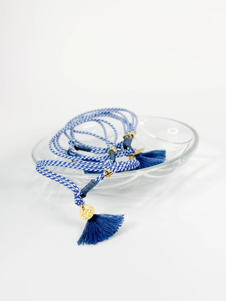 Χειροποίητο Μαρτυρικό βραχιόλι για αγόρι σε μπλε αποχρώσεις με χρυσές λεπτομέριες, διακοσμητικά φουντάκια και βραχιόλι από κορδονάκι.