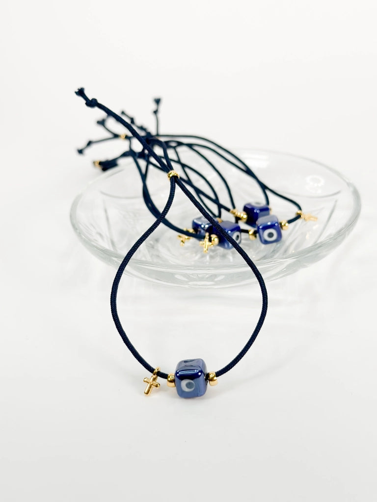 Χειροποίητο Μαρτυρικό βραχιόλι για αγόρι σε μπλε αποχρώσεις με μίνιμαλ σχέδιο και χρυσές λεπτομέριες.