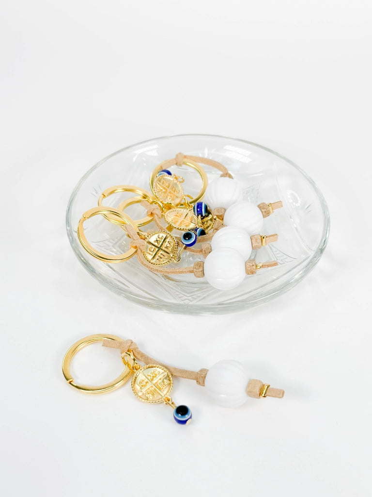 Χειροποίητο Μαρτυρικό μπρελόκ για κορίτσι σε χρυσό με διακοσμητικό ματάκι και λευκή χάντρα.