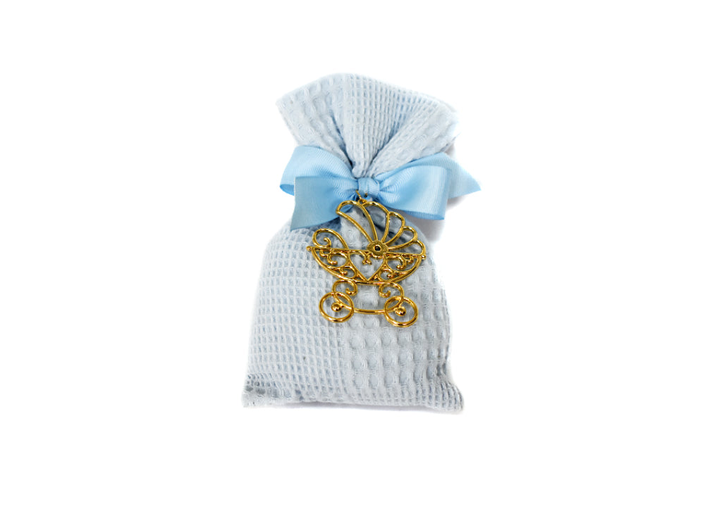 Μπομπονιέρα πουγκί σιέλ με καρότσι.