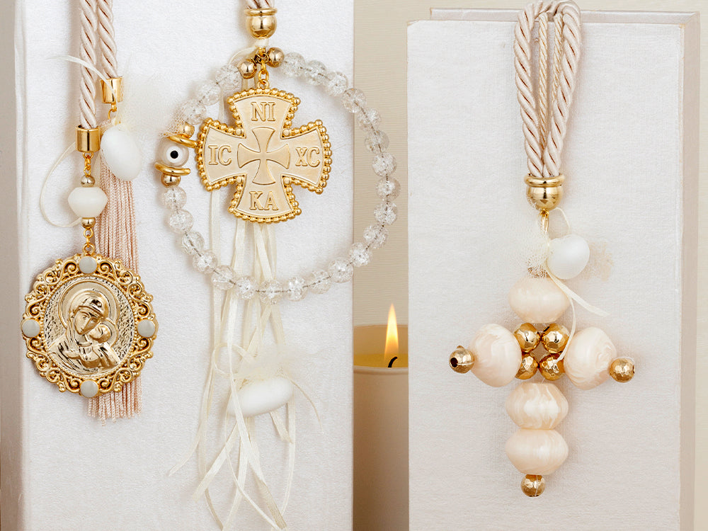Μπομπονιέρα σταυρός εκρού με χάντρες.