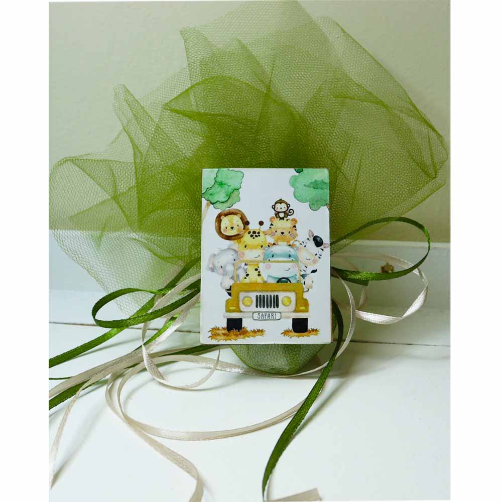 Χειροποίητη μπομπονιέρα βάπτισης με σχέδιο κάρτα εκτύπωση σαφάρι.
