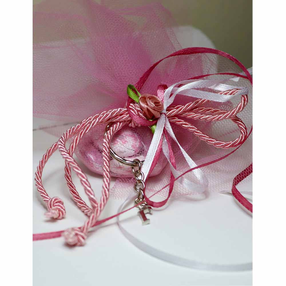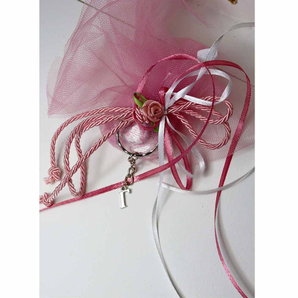 Χειροποίητη μπομπονιέρα βάπτισης με σχέδιο λουλούδι και μπρελόκ με αρχικά.