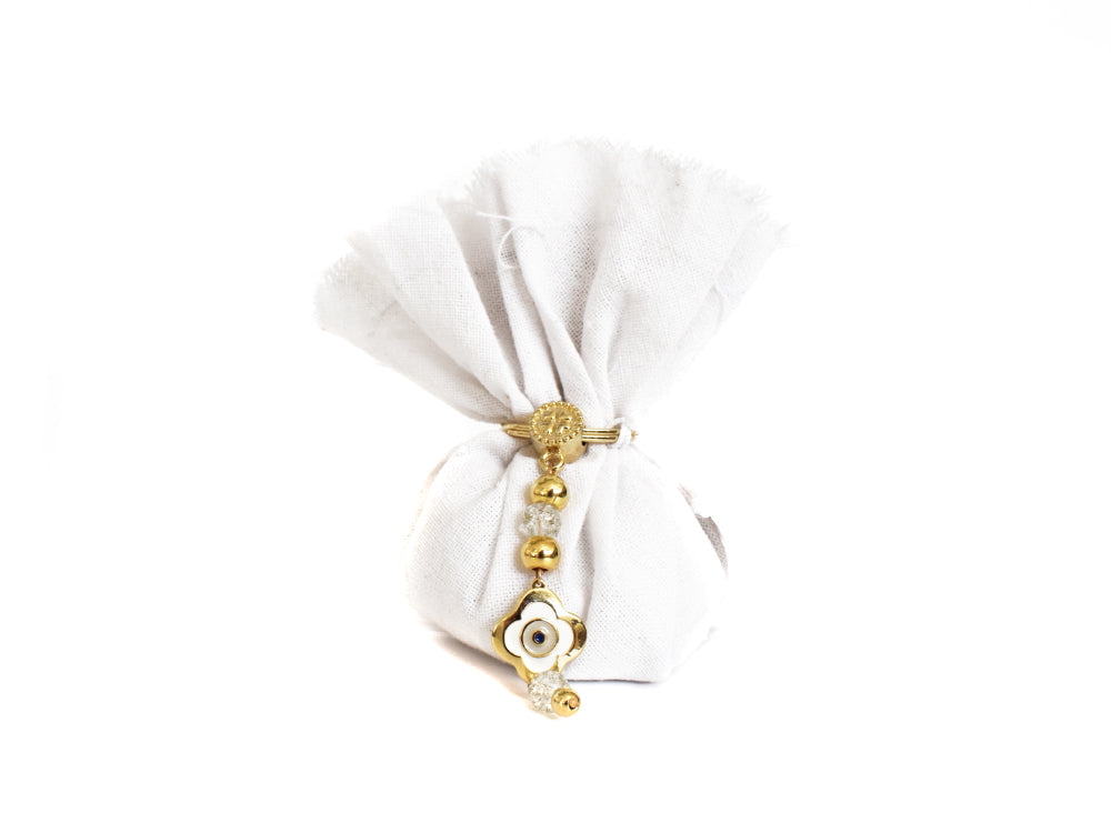 Μπομπονιέρα πουγκί λευκό με μπρελόκ γούρι μάτι.