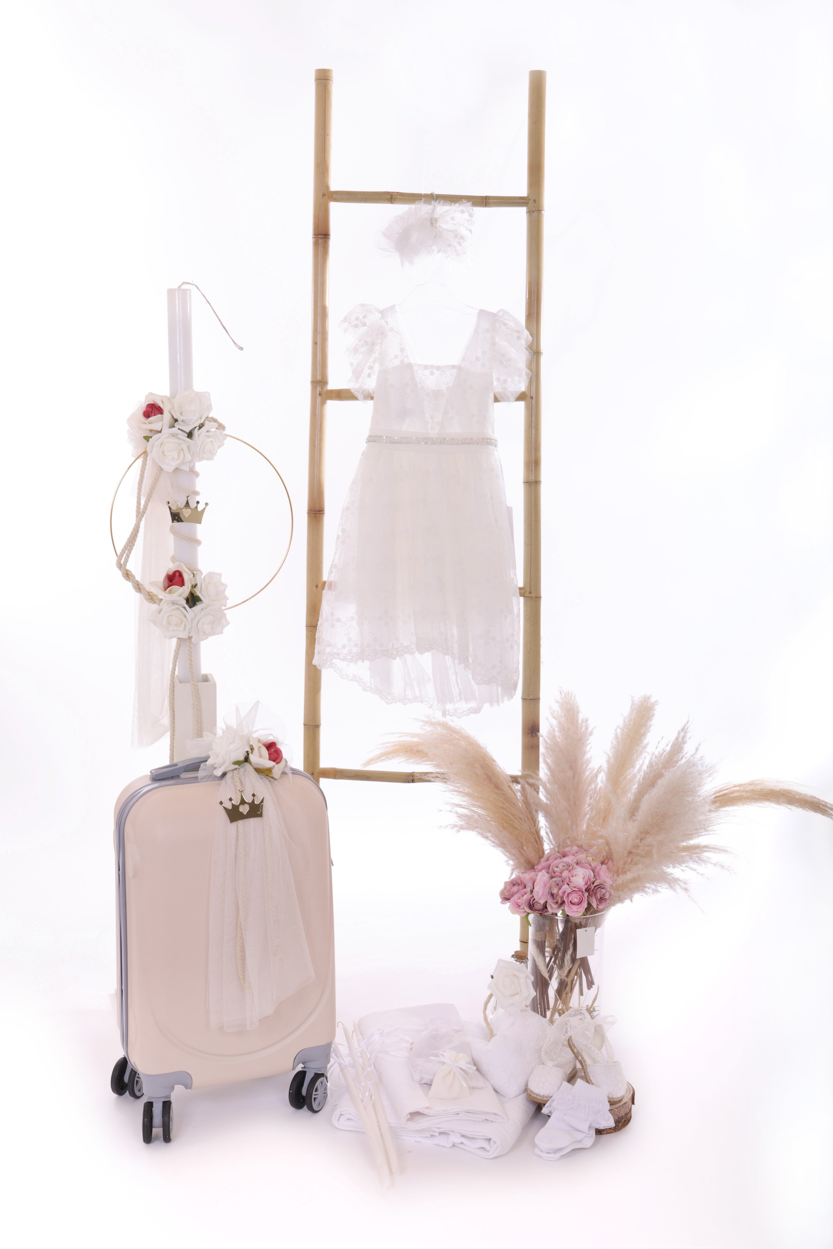 Κλασική κομψότητα με φόρεμα δαντέλας, ασορτί παπούτσια και ρομαντική λαμπάδα για μια βάπτιση γεμάτη γοητεία!