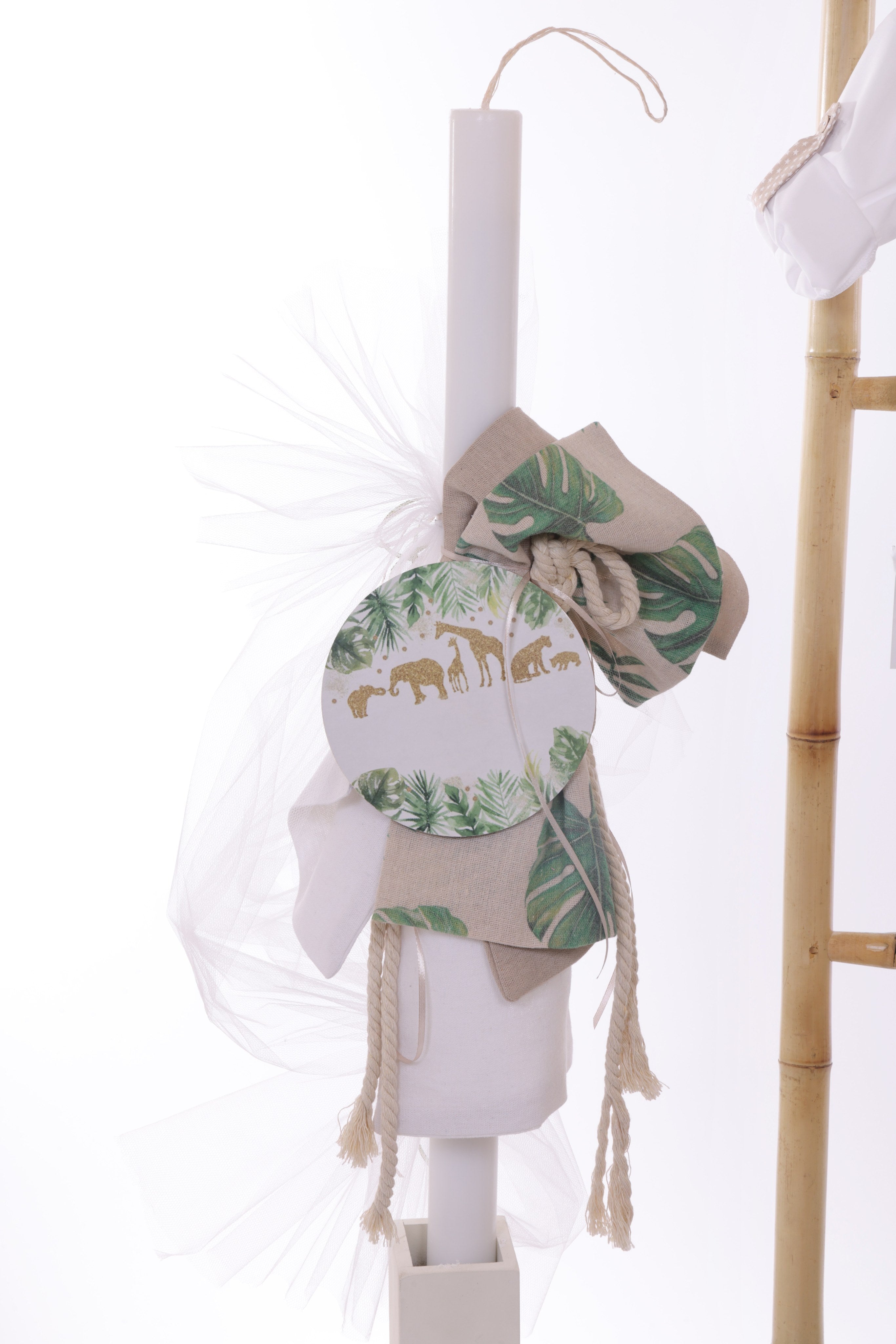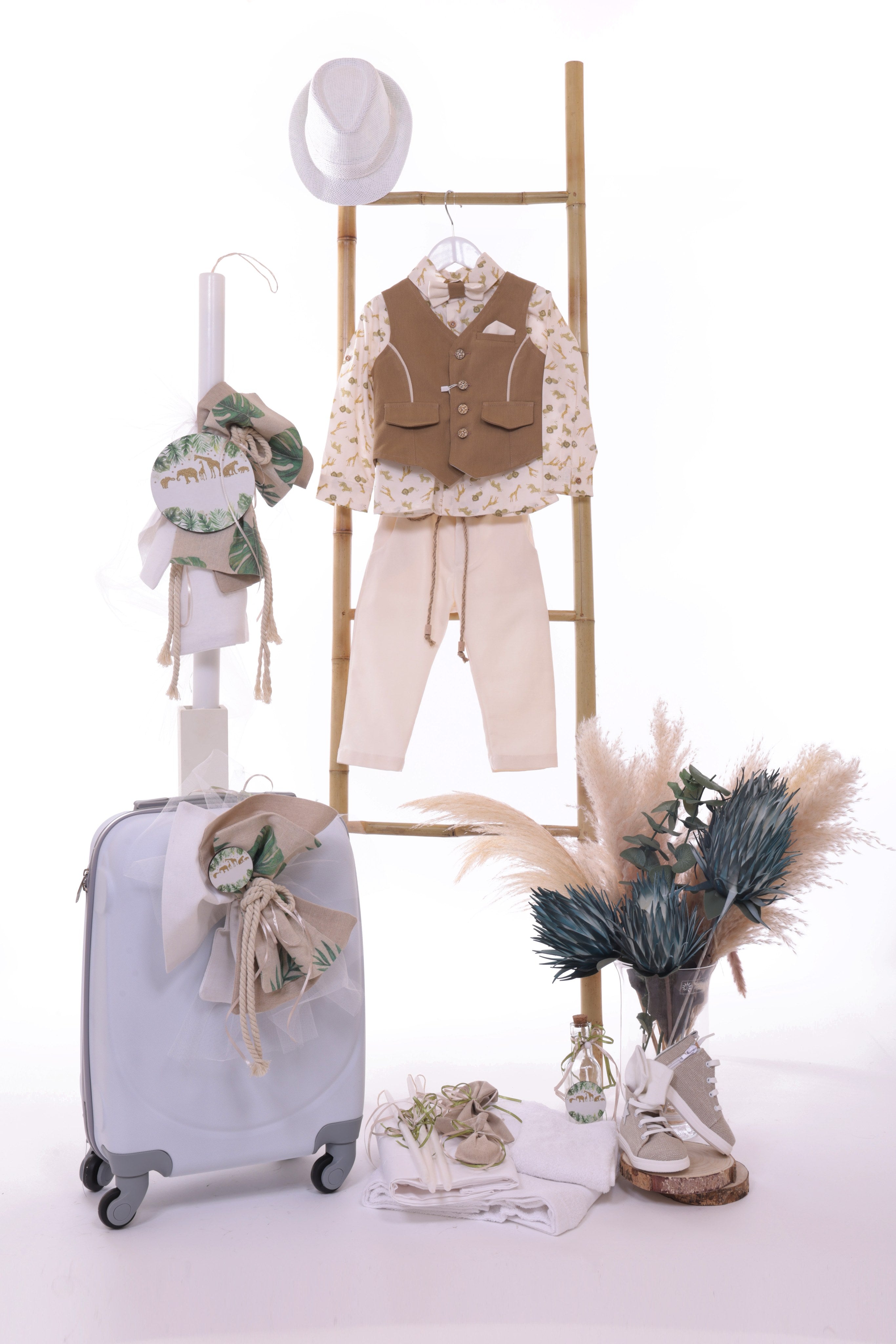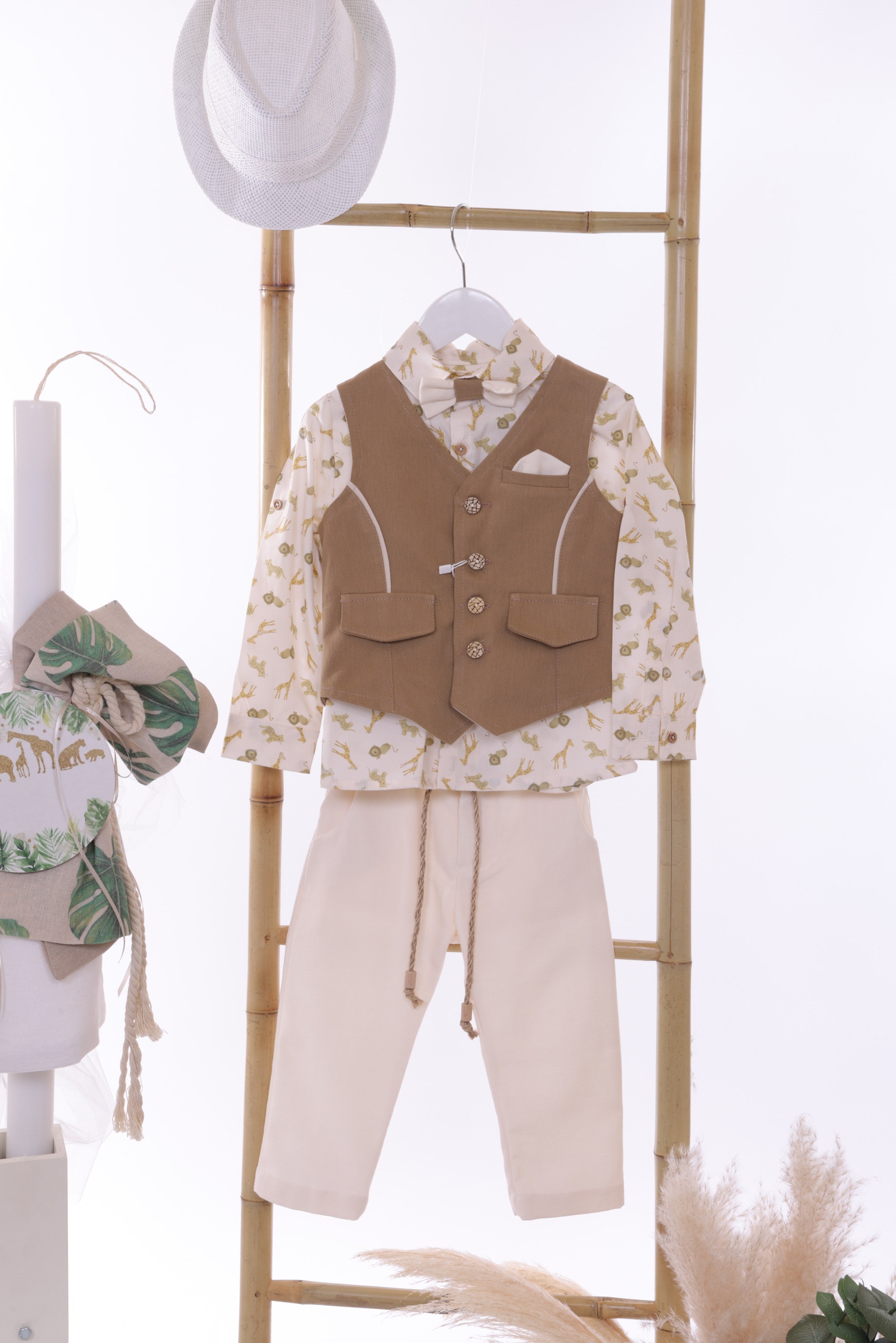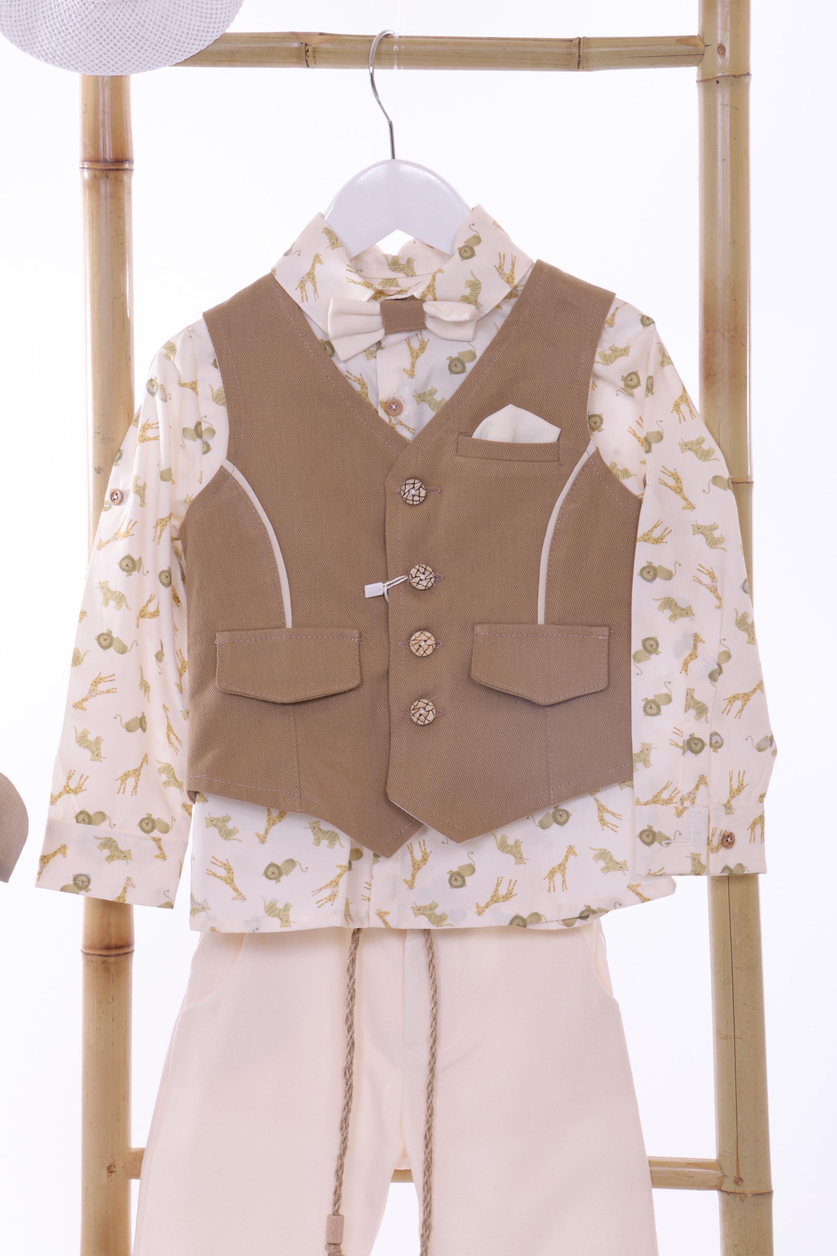 Ένα πραγματικά αξιολάτρευτο, ολοκληρωμένο πακέτο βάπτισης για αγόρι με θέμα τα ζώα της ζούγκλας σε γήινες κάμελ και εκρού αποχρώσεις, με jungle print πουκάμισο . Ιδανικό για έναν μικρό κύριο με στυλ!