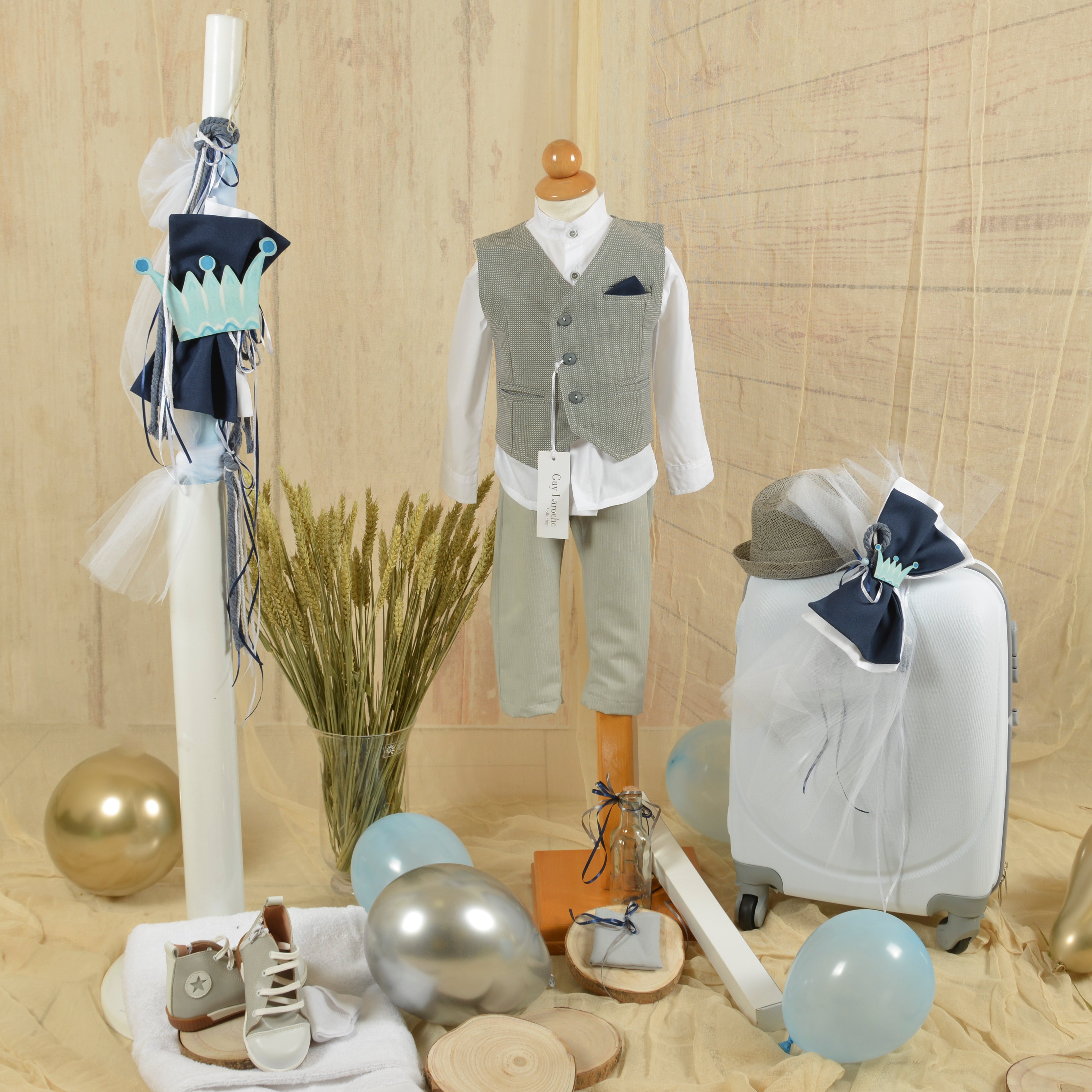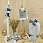 Ένα ολοκληρωμένο πακέτο βάπτισης για τον μικρό σας πρίγκιπα με θέμα κορώνα σε γκρι, λευκό, μπλε και γαλάζιο χρώμα.