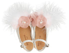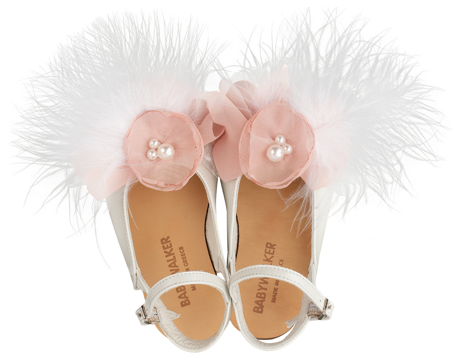 Δερμάτινο Σαμπό Διακοσμημένο με Χειροποίητο Chiffon Λουλούδι και Πούπουλα από Δέρμα Πέρλα σε Εκρού Ροζ Χρώμα