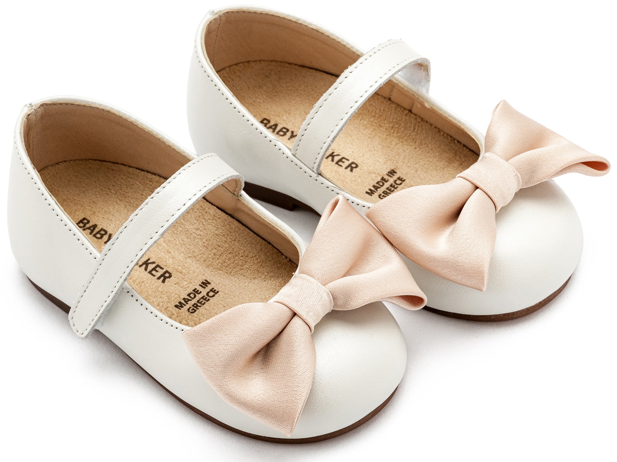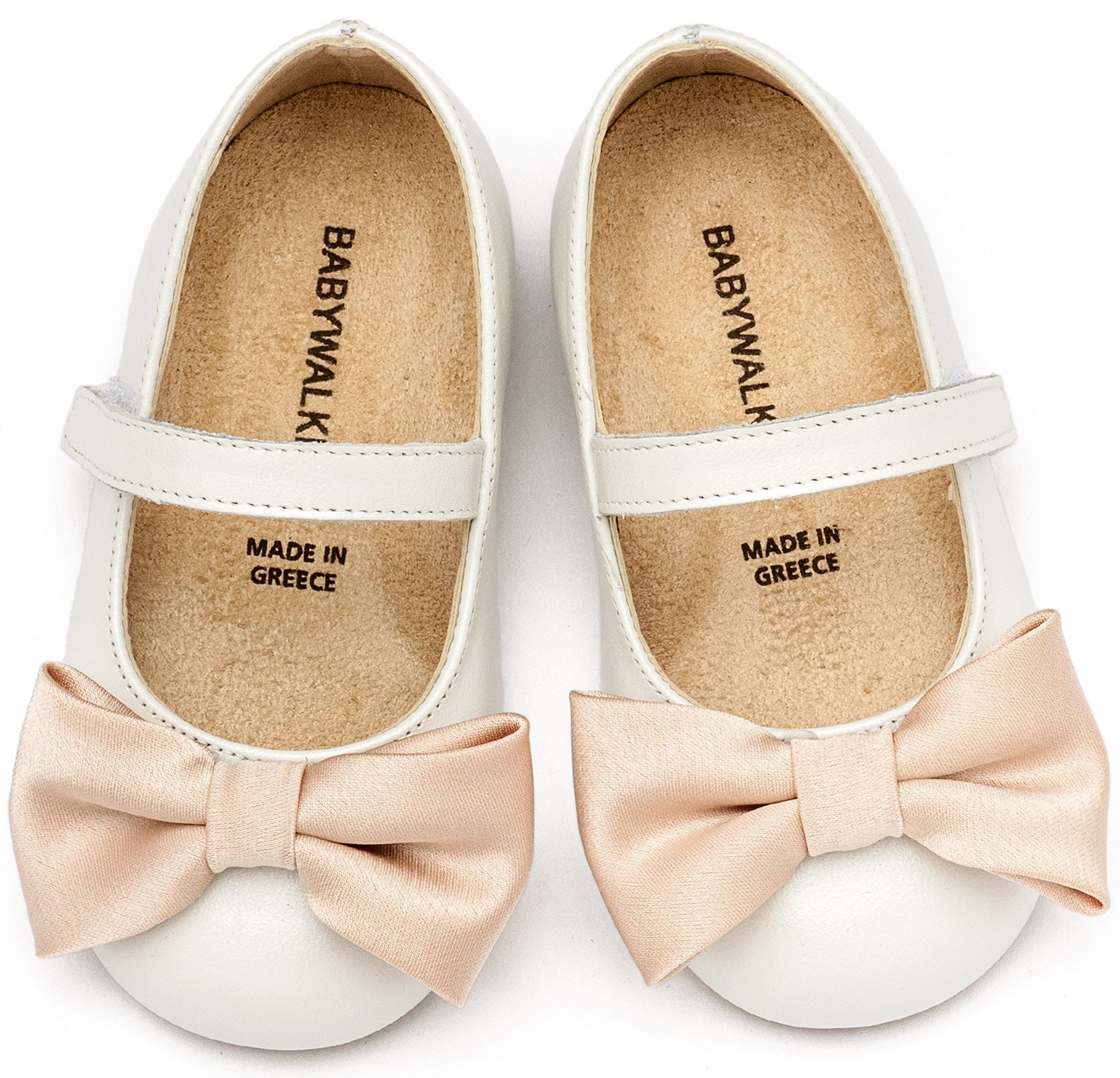 Δερμάτινο Γοβάκι Μονή Μπαρέτα Χρατς με Σατέν Χειροποίητο Φιογκάκι σε Εκρού Μπεζ Χρώμα