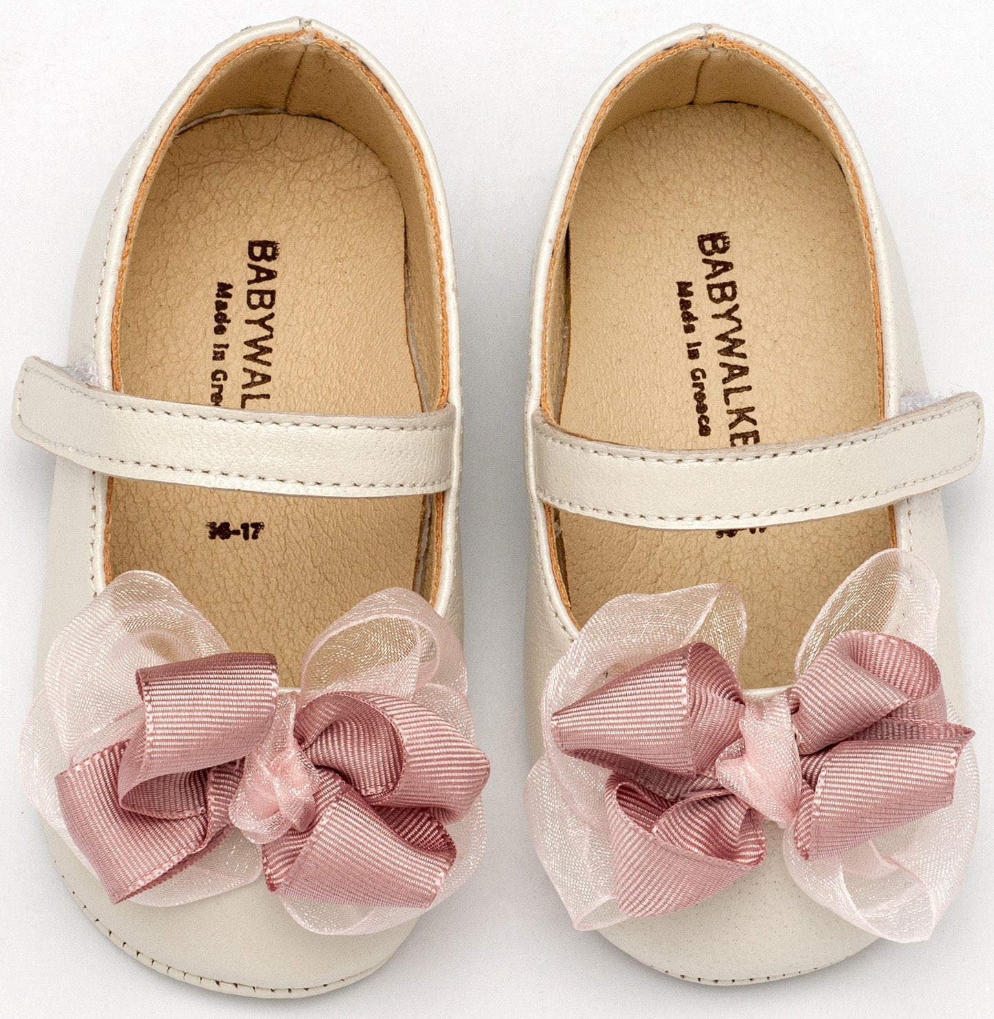 Δερμάτινο Γοβάκι Μονή Μπαρέτα με Υφασμάτινο Χειροποίητο Φιογκάκι σε Εκρού Ροζ Χρώμα