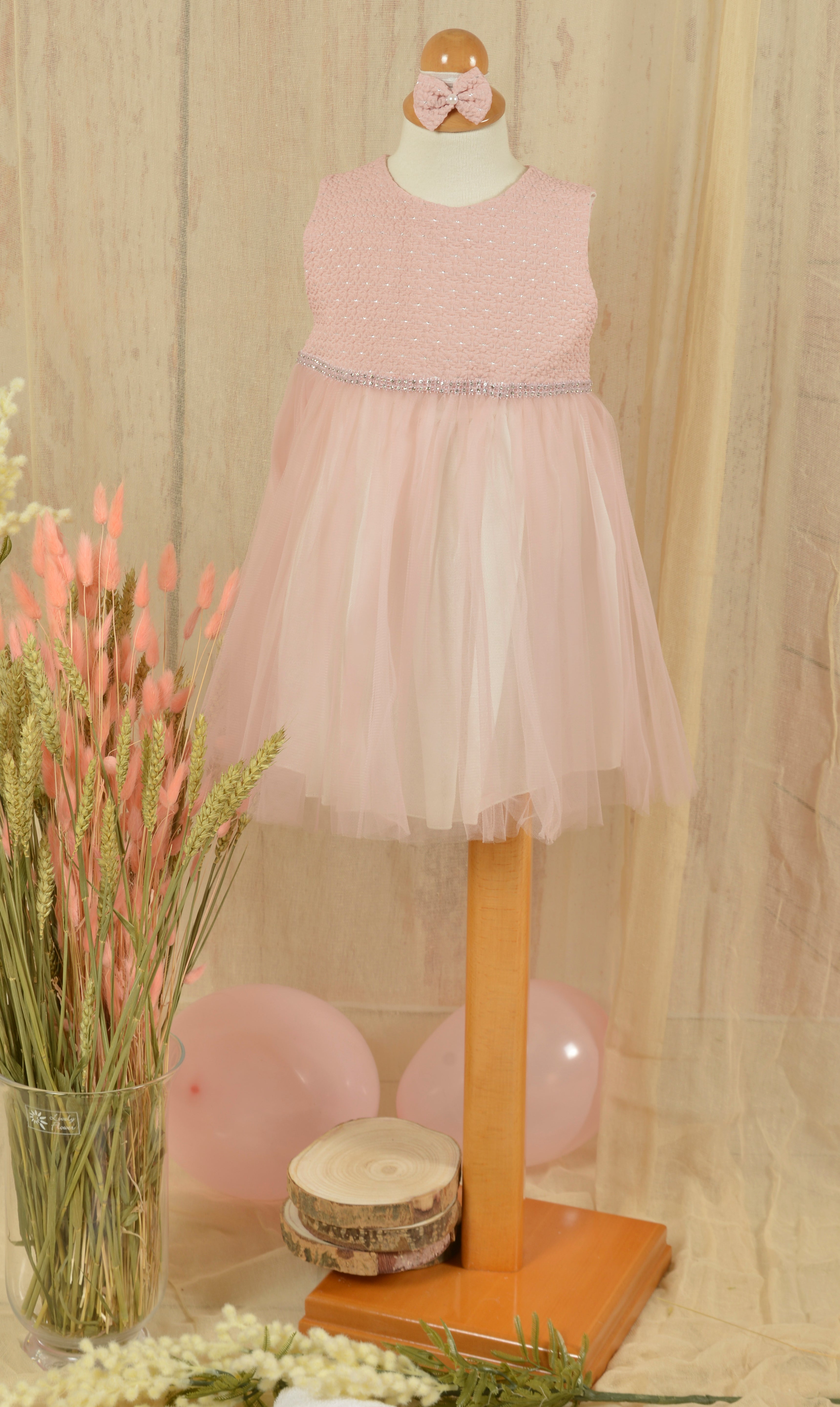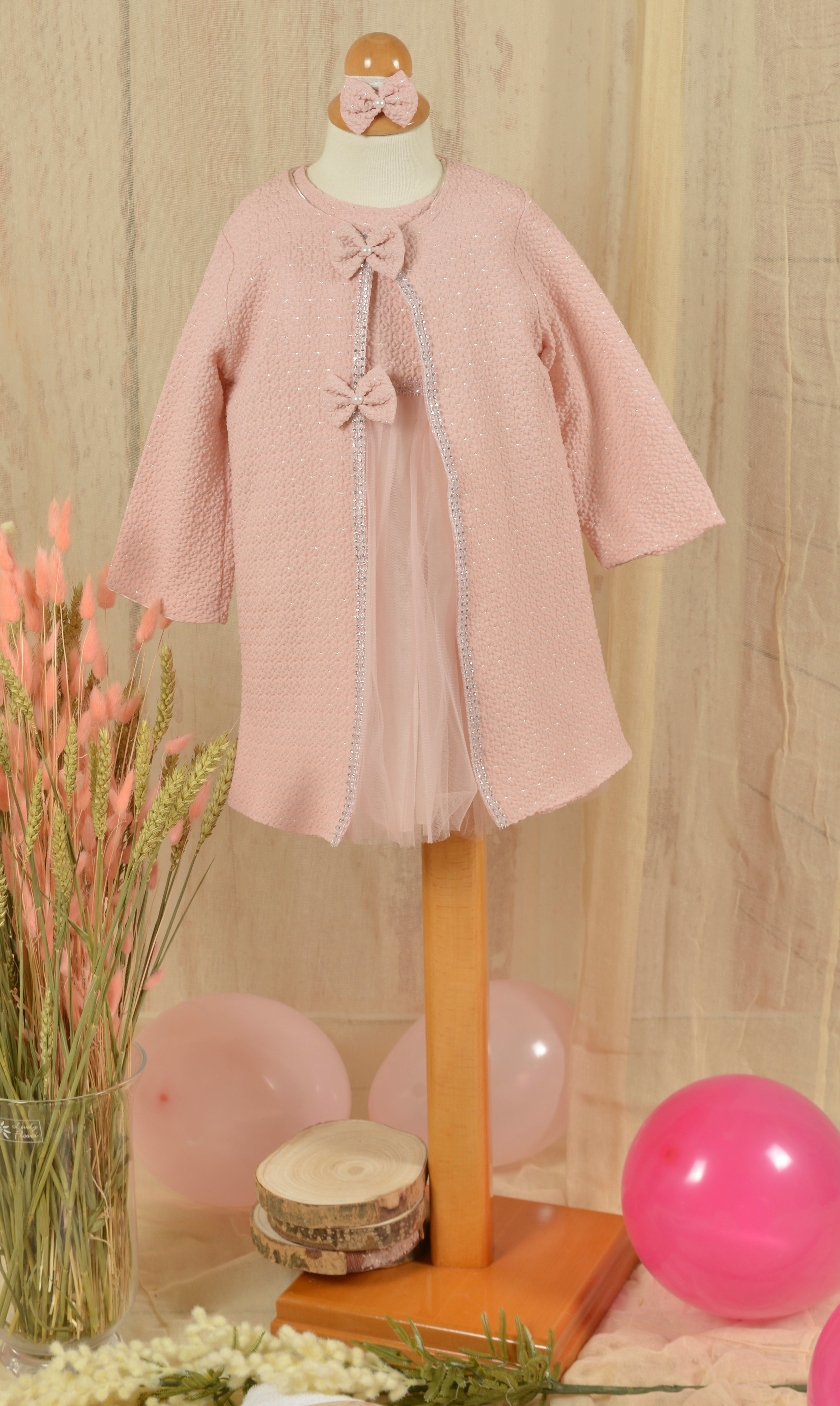 A wonderful christening dress and jacket set for little ladies, in pink and rotten apple shades, with tulle layers, a rhinestone belt and silver decorative touches, offering a sense of classic luxury.