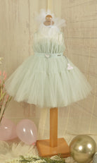 A princess dress in pastel shades of mint, with tulle layers, a pink sash with a decorative rhinestone heart, that will enchant every little girl and godmother!