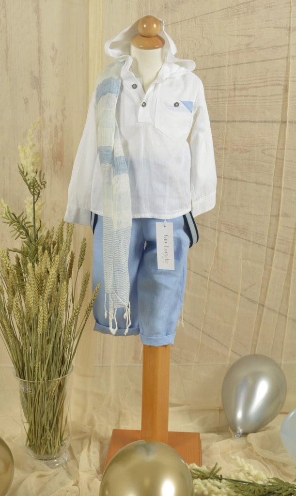 A summery, travel-inspired outfit from Guy Laroche, for the most unique look for your little one! In light blue and white tones, with a matching boy's scarf, it's the perfect outfit for summer. An amazing christening outfit for a boy!