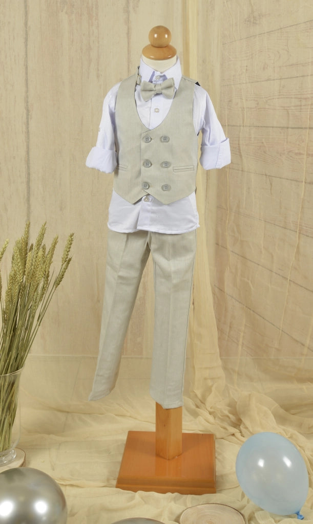 Christening Gown for Boy with Vest in Light Gray-Beige