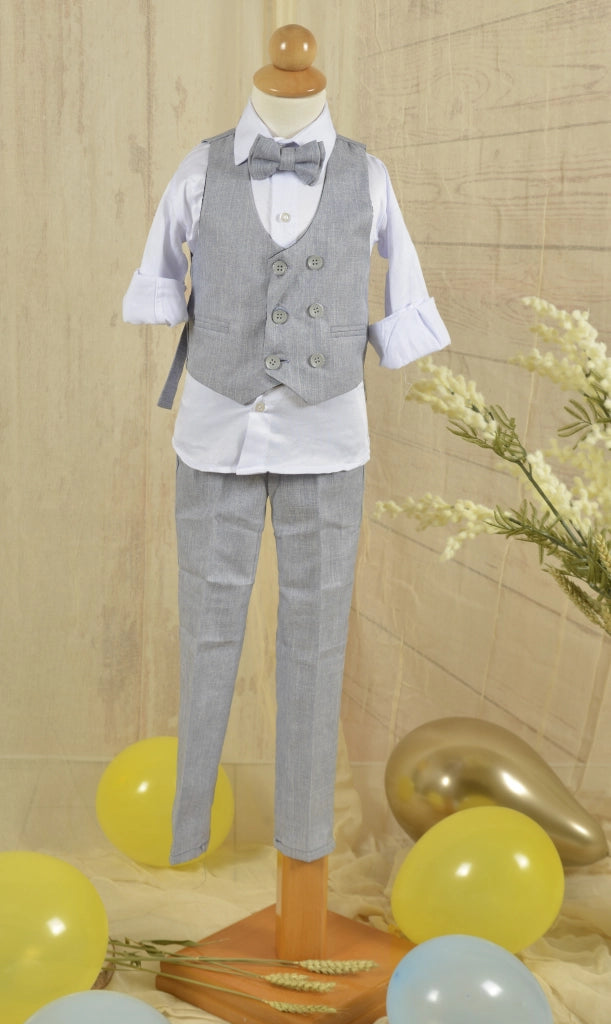 A classic boy's set in light gray, for the most elegant look for your little one! Pants, vest and jacket with matching bow tie and hat, and, of course, a white shirt. The perfect christening outfit for a boy!