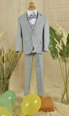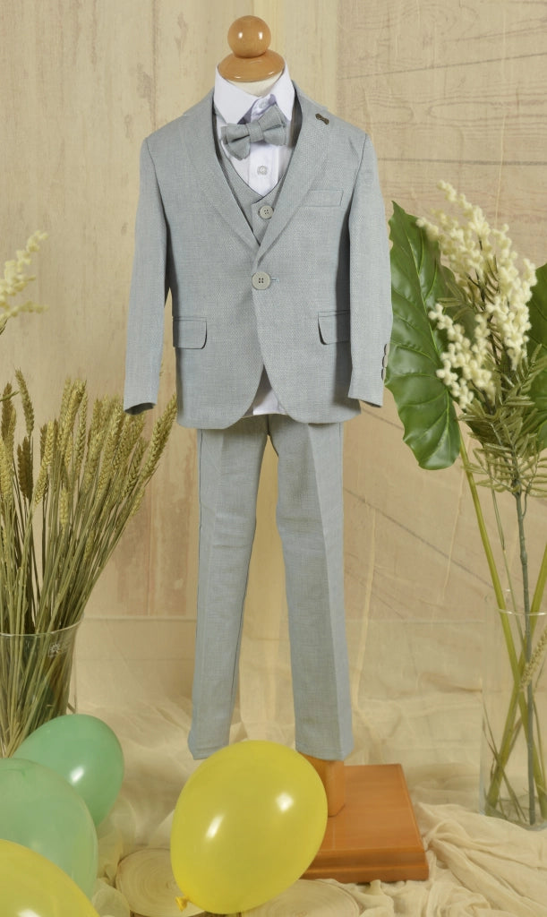 A very elegant set for little gentlemen, in light blue. Jacket, vest and trousers with matching bow tie and hat, and of course, a white shirt. A unique christening outfit for a boy!