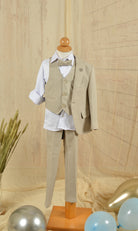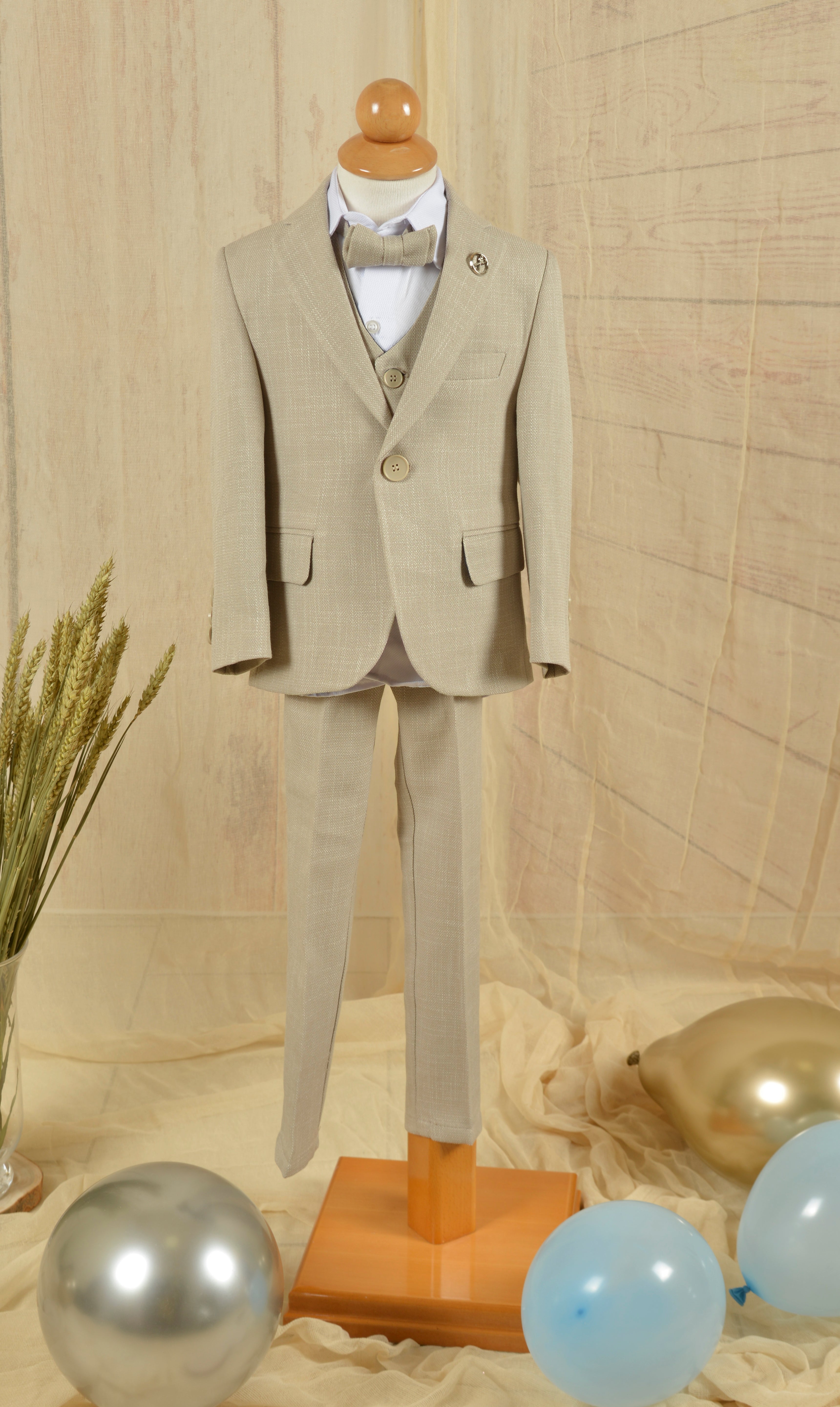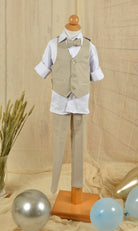 An elegant combination for little gentlemen, in beige and white! Beige pants, vest and jacket with matching bow tie and white shirt. Ideal for your little one's christening.