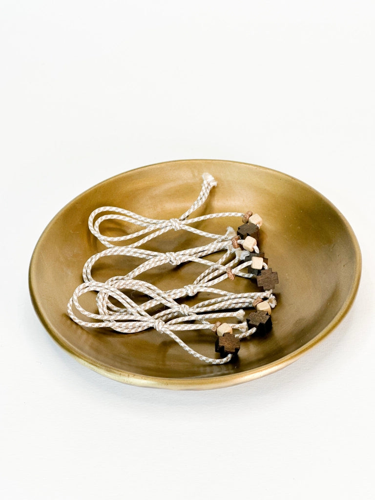 Martyrdom lapel with brown cross, beige bead, brown washer, two-tone cord in beige and white. The photos have been edited, the colors may differ slightly in reality.
