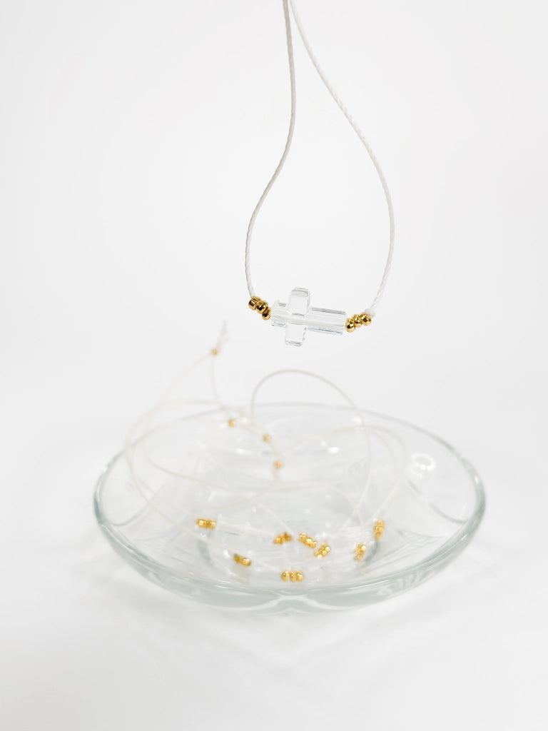 Handmade martyr bracelet with white strap, transparent cross and gold decoration.