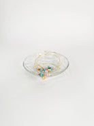 Handmade martyr bracelet for a girl in gold metal with a romantic design of beads in pink and light blue.