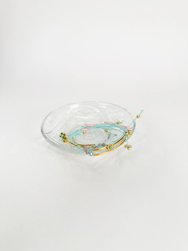 Handmade martyr bracelet for a girl with gold metal, light blue strap and pink details.