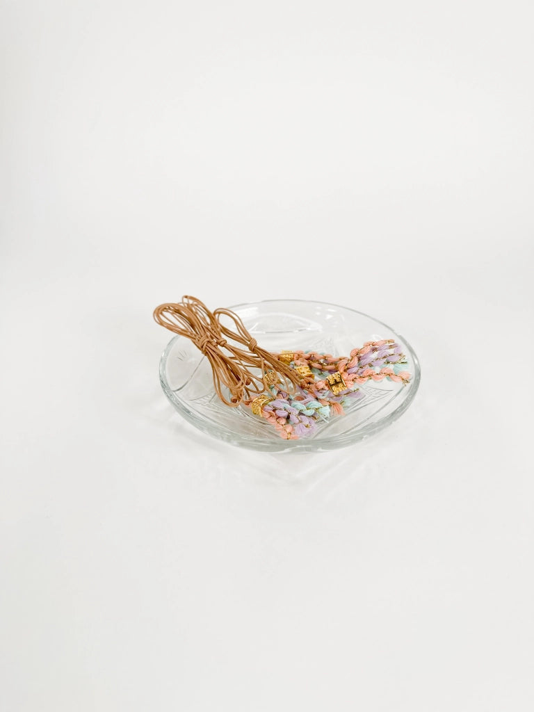 Handmade martyr bracelet with brown strap and decoration in soft tones and gold details.