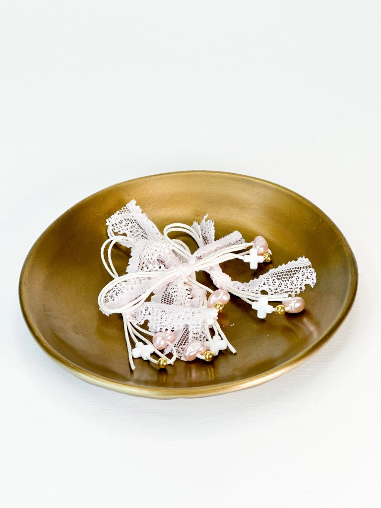 Martyrdom lapel with ecru cord, white cross, pink pearl and pink lace bow. The photos have been edited, the colors may differ slightly in reality.