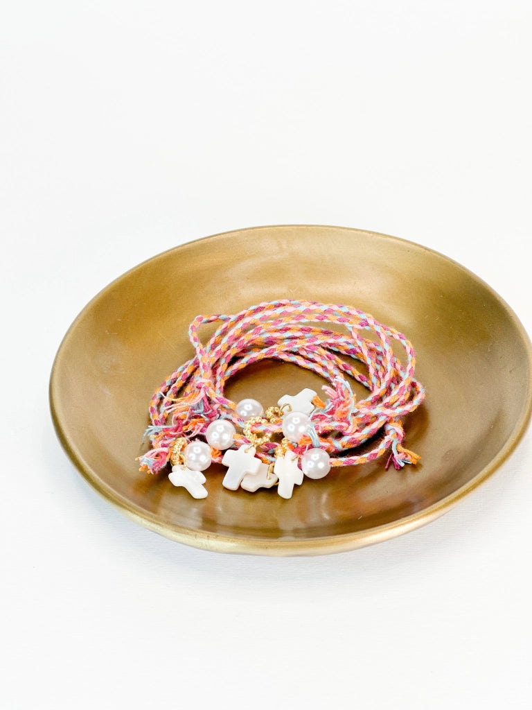 Martyrdom bracelet with cord in pink, purple, orange, blue shades, pearl and cross. The photos have been edited, the colors may differ slightly in reality.