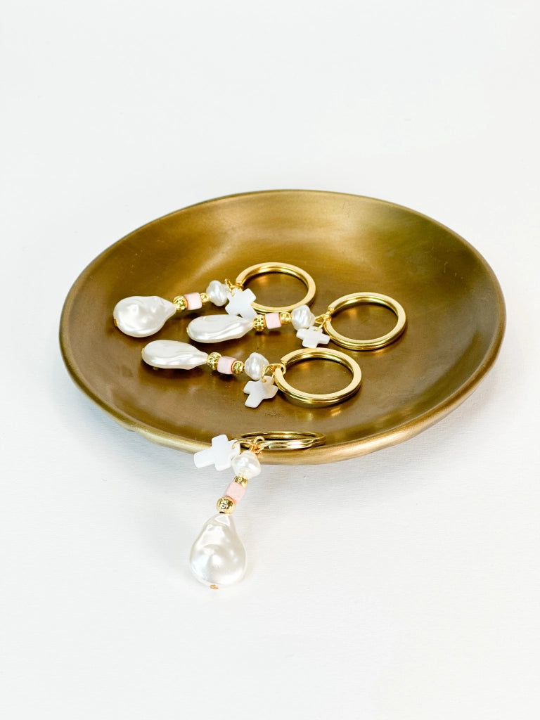 Martyrdom keychain with cross, small round pearl and large flat, pink square bead. The photos have been edited, the colors may differ slightly in reality.
