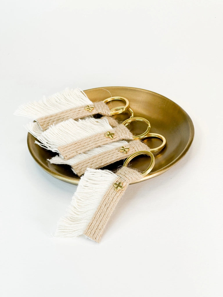 Martyrdom keychain with cross, burlap and ecru fringe. The photos have been edited, the colors may differ slightly in reality.