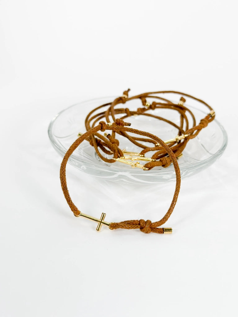 Handmade martyr bracelet for a boy with a simple, delicate design in brown and gold.