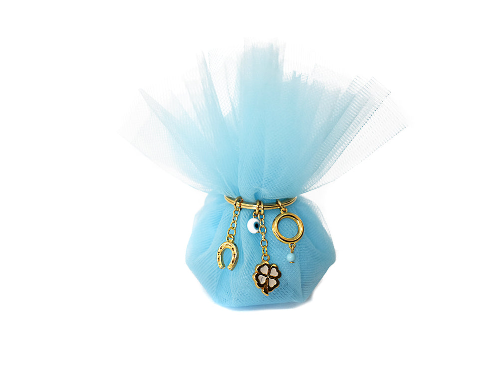 Μπομπονιέρα πουγκί σιέλ με τετράφυλλο και πέταλο.