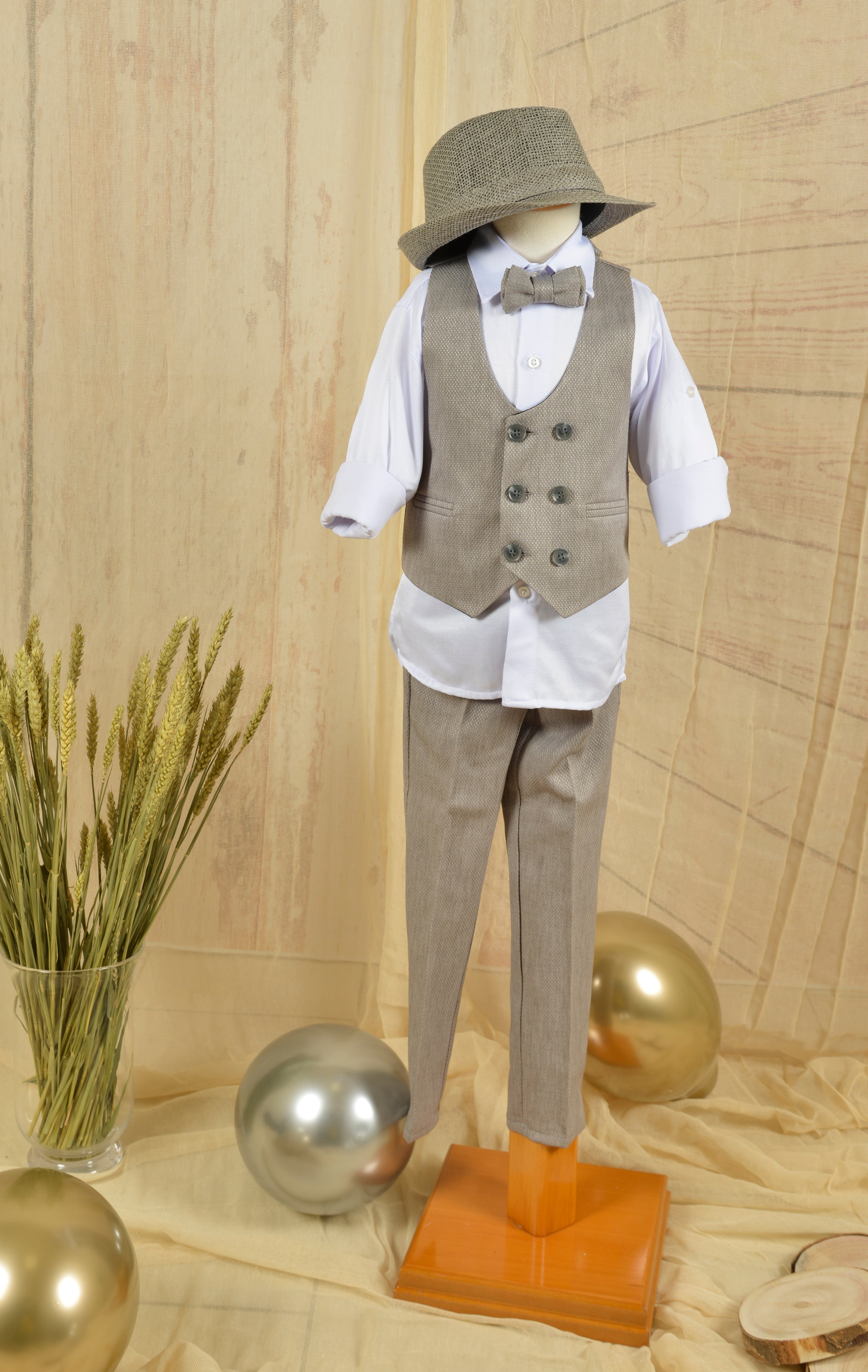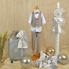 A complete baptism package for your little one with a teddy bear theme in soft colors of gray, sand beige and white!