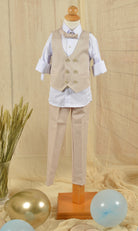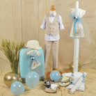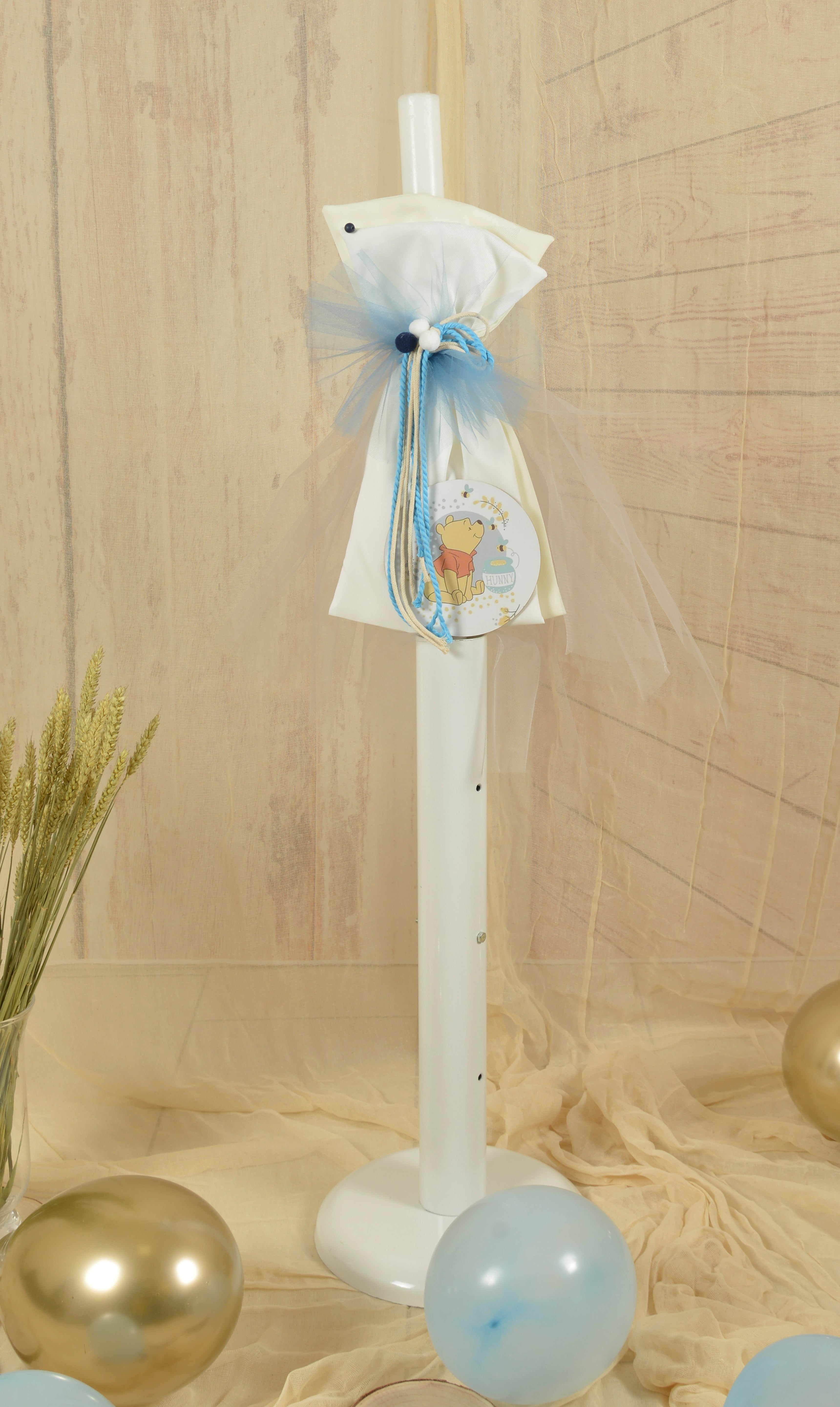 A complete baptism package for your little one with a Winnie the Pooh theme in light blue and beige ecru colors.