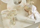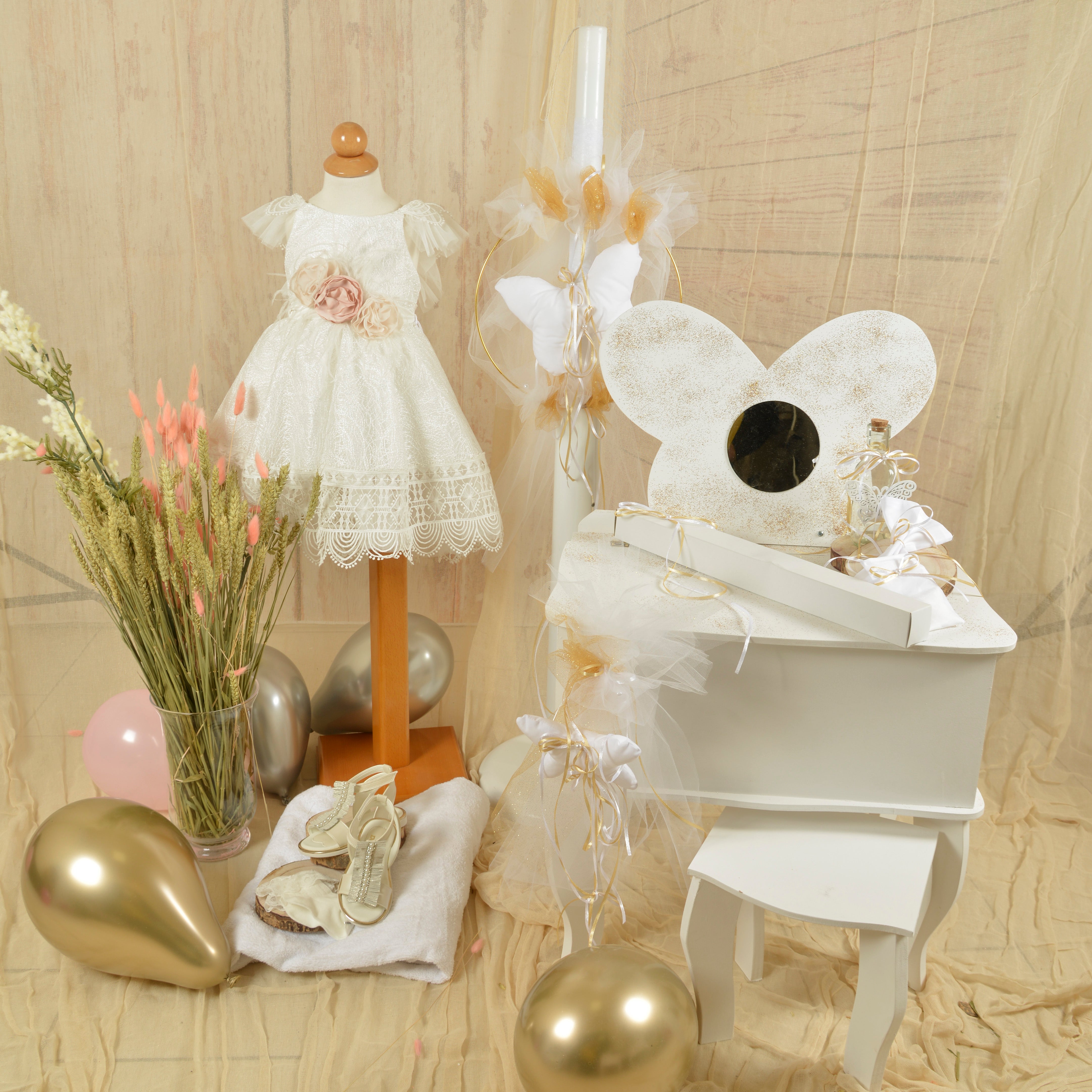 A romantic, complete baptism package for your little butterfly, in ivory, gold and glitter shades.